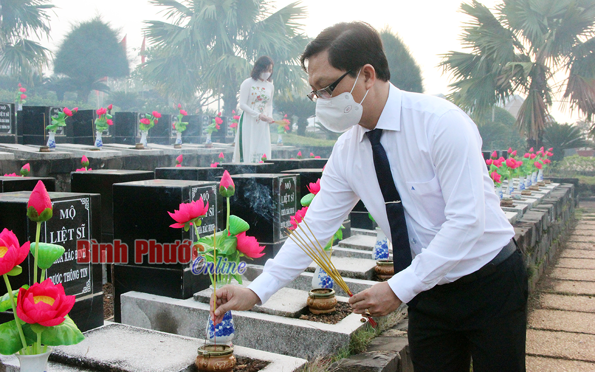 Ủy viên Ban Thường vụ, Trưởng ban Tuyên giáo Tỉnh ủy Hà Anh Dũng thắp hương lên các phần mộ liệt sĩ đang được an táng tại Nghĩa trang liệt sĩ tỉnh