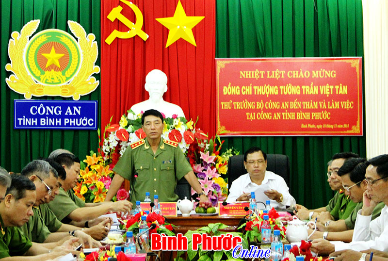 Phát biểu tại buổi làm việc, thượng tướng Trần Việt Tân cho biết: Đoàn công tác của Bộ Công an làm việc với tỉnh nhằm kiểm tra các mặt của ngành công an trên địa bàn năm 2014 để chuẩn bị cho hội nghị công an toàn quốc lần thứ 70. Công an tỉnh báo cáo sát tình hình an ninh trật tự trên địa bàn tỉnh và kết quả thực hiện nghị quyết của Đảng. Qua kiểm tra, đã đánh giá kết quả đạt được, đồng thời chỉ ra những hạn chế, đoàn công tác và Công an tỉnh cùng phân tích nguyên nhân và đề ra giải pháp khắc phục trong thời gian tới.
