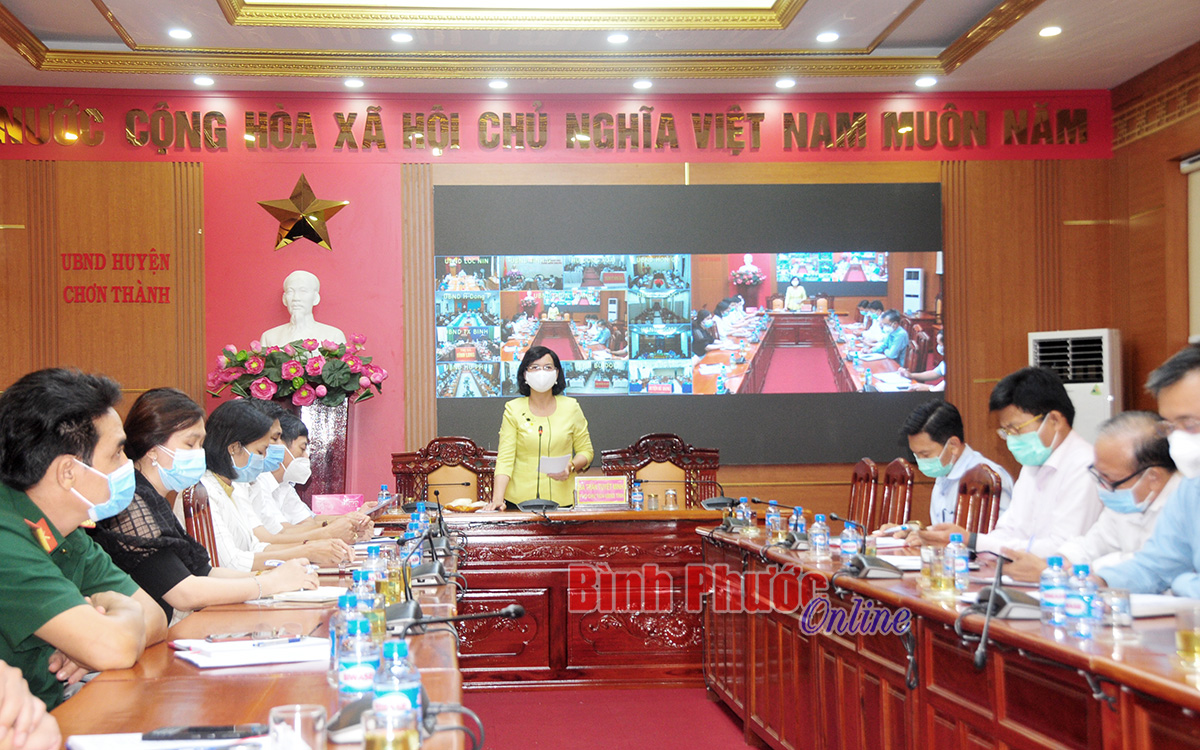 Tại điểm cầu huyện Chơn Thành, Ủy viên Ban Thường vụ Tỉnh ủy, Phó chủ tịch UBND tỉnh, Phó trưởng ban Thường trực Ban chỉ đạo phòng, chống Covid-19 Trần Tuyết Minh dự và chủ trì.
