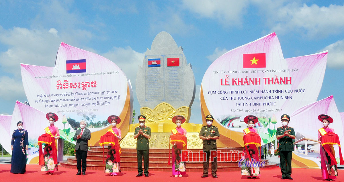 Cắt băng khánh thành Cụm công trình lưu niệm hành trình cứu nước của Thủ tướng Vương quốc Campuchia Hun Sen tại khu vực X16, xã Lộc Tấn, huyện Lộc Ninh, tỉnh Bình Phước, tháng 6-2021