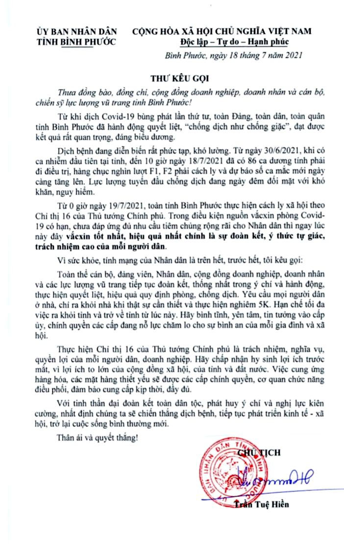 Bình Phước online trân trọng đăng toàn văn Thư kêu gọi của Chủ tịch UBND tỉnh: