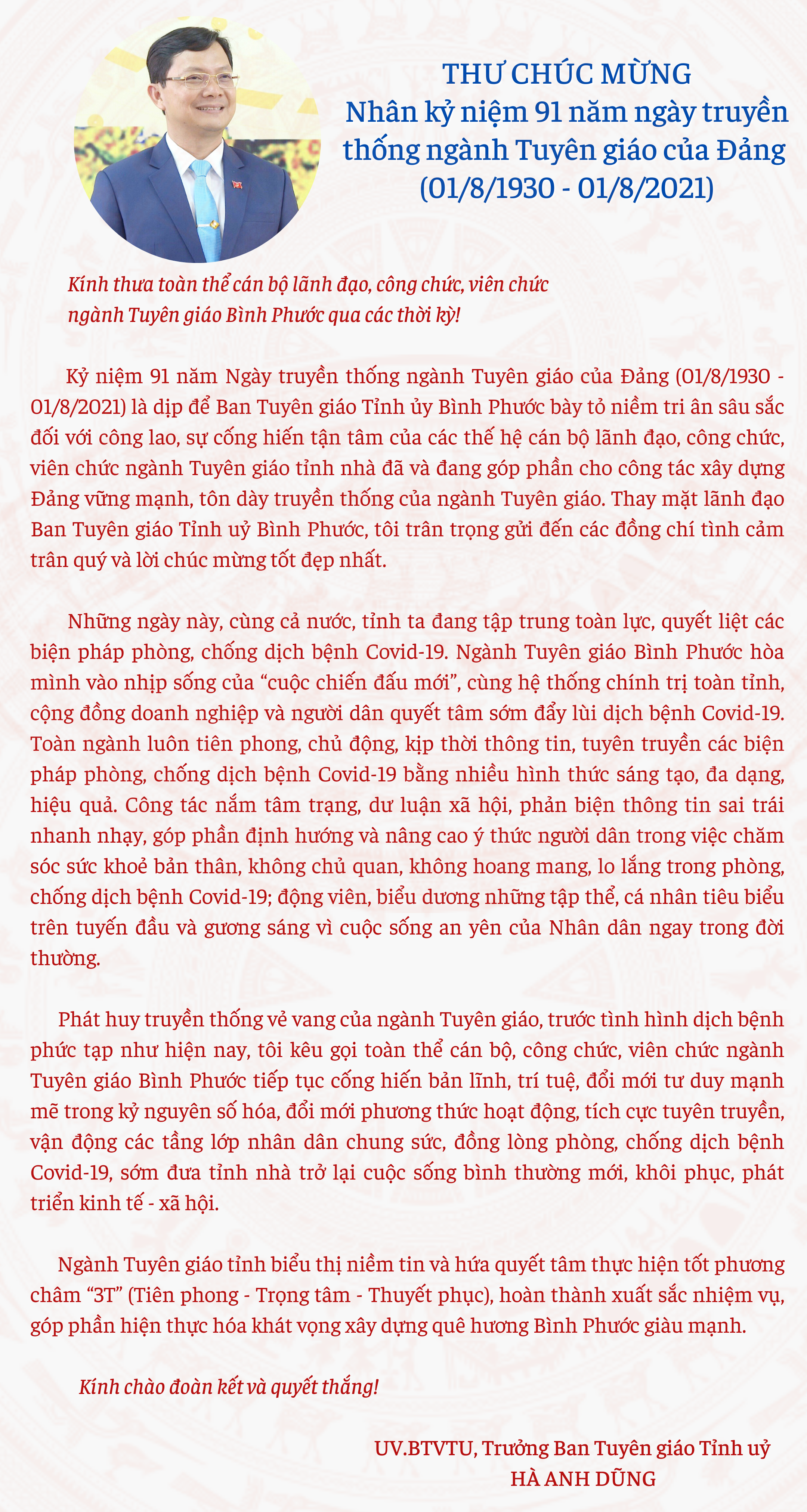 Bình Phước online trân trọng đăng toàn văn Thư chúc mừng của Trưởng ban Tuyên giáo Tỉnh ủy Hà Anh Dũng.