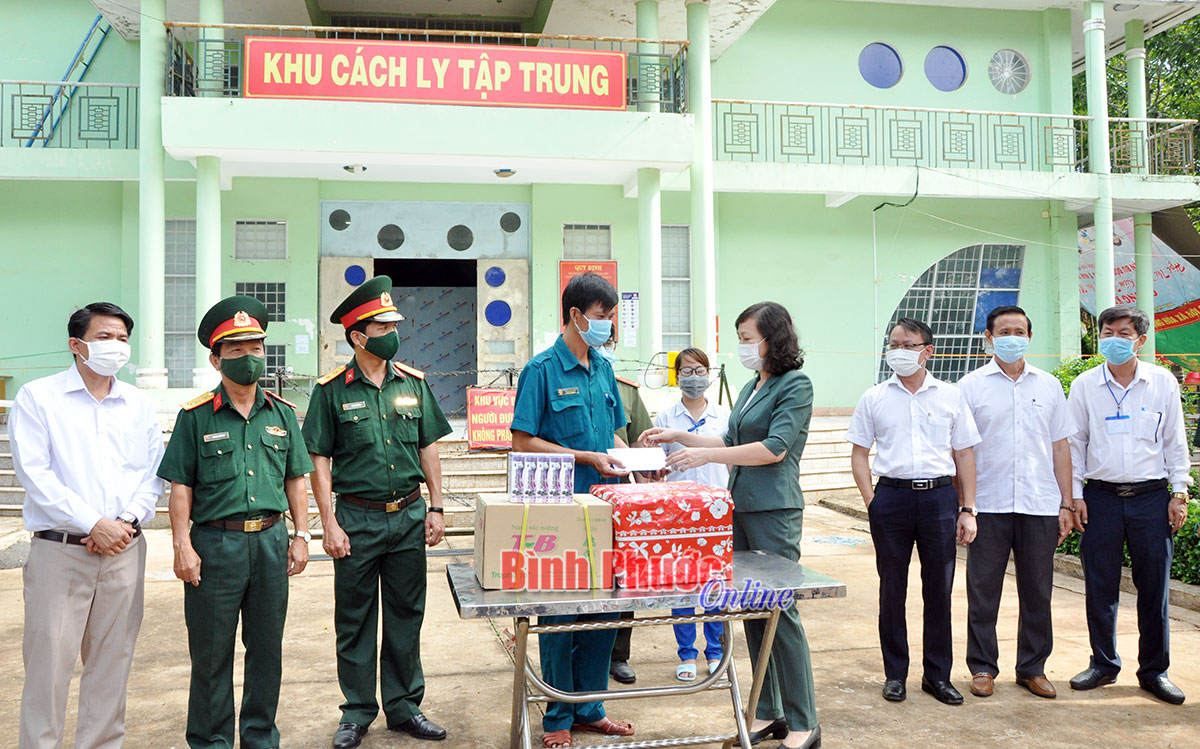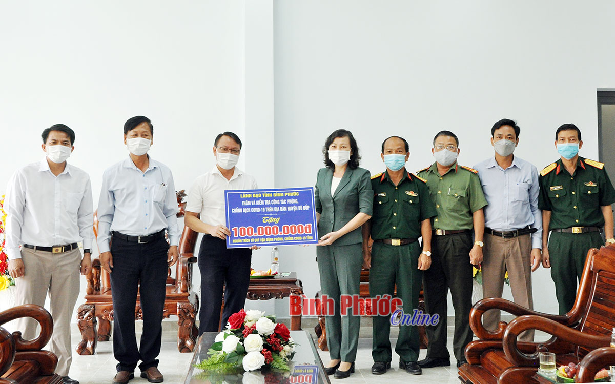 Dịp này, Phó bí thư Thường trực Tỉnh ủy, Chủ tịch HĐND tỉnh Huỳnh Thị Hằng đã trao 100 triệu đồng trích từ Quỹ phòng, chống Covid-19 của tỉnh để hỗ trợ huyện Bù Đốp trong công tác phòng, chống dịch.