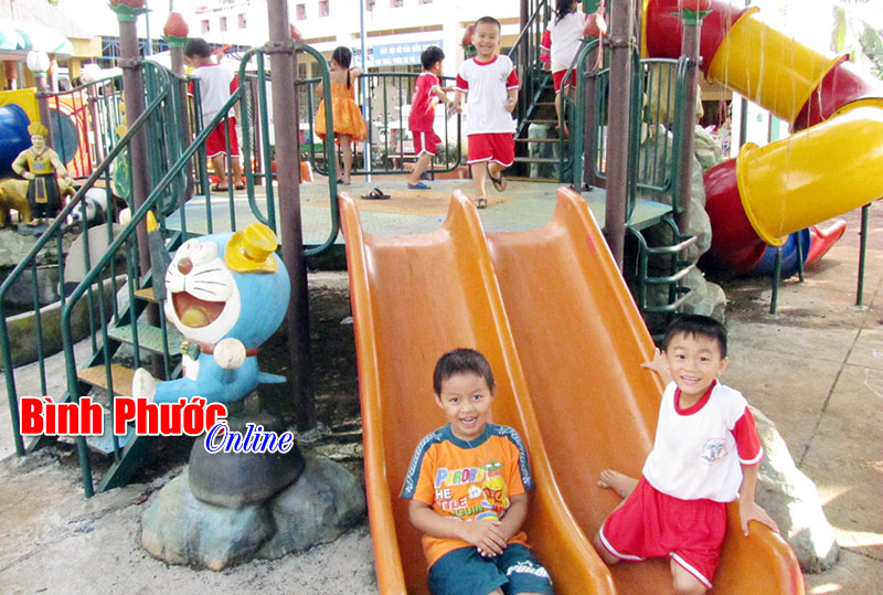 Chất lượng giáo dục toàn diện cho học sinh các cấp ngày càng được nâng cao (Trong ảnh: Học sinh trường mầm non Phú Riềng B trong giờ giải lao)