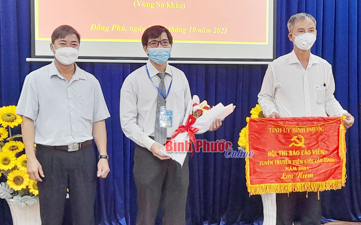 Phó bí thư Thường trực Huyện ủy Đồng Phú Đinh Văn Kỹ trao hoa và cờ của ban tổ chức hội thi cho đơn vị Đồng Phú