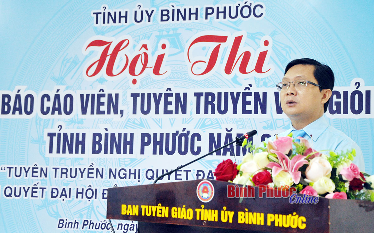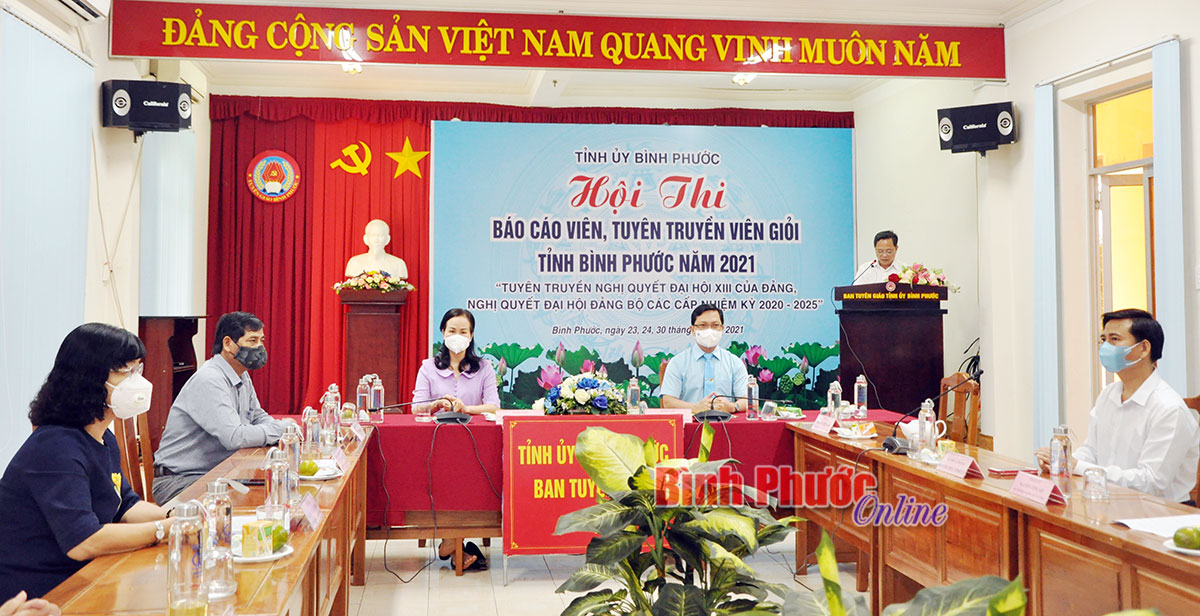 Phát biểu khai mạc hội thi, Ủy viên Ban Thường vụ, Trưởng ban Tuyên giáo Tỉnh ủy, Trưởng ban tổ chức hội thi Hà Anh Dũng nhấn mạnh: Hội thi diễn ra trong không khí cán bộ, đảng viên, nhân dân và cả hệ thống chính trị tỉnh Bình Phước đang phấn khởi, tự hào kỷ niệm 92 năm ngày thành lập Chi bộ Đông Dương cộng sản Đảng. Đồng thời, ra sức phấn đấu thực hiện thắng lợi Nghị quyết Đại hội XIII của Đảng và Nghị quyết Đại hội Đảng bộ tỉnh lần thứ XI, nhiệm kỳ 2020 - 2025; đặc biệt thực hiện có hiệu quả Nghị quyết số 05-NQ/TU về sẵn sàng ứng phó với mọi tình huống diễn biến của dịch bệnh Covid-19.