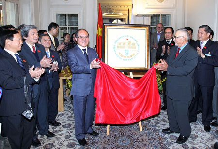 Chủ tịch Quốc hội Nguyễn Sinh Hùng và Chủ tịch Liên minh Nghị viện thế giới Abdelwahad Radi tại lễ công bố lô-gô IPU-132 tại Việt Nam. Ảnh do Văn phòng Quốc hội cung cấp. |