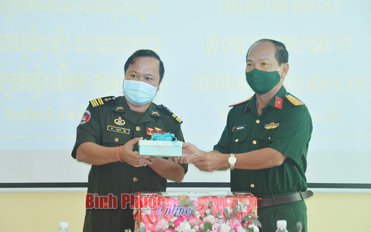 Bộ CHQS tỉnh tặng quà Tiểu khu quân sự tỉnh Mundulkiri (Vương quốc Campuchia) hỗ trợ phòng chống dịch Covid-19