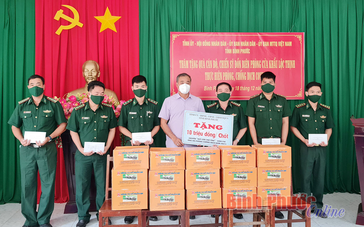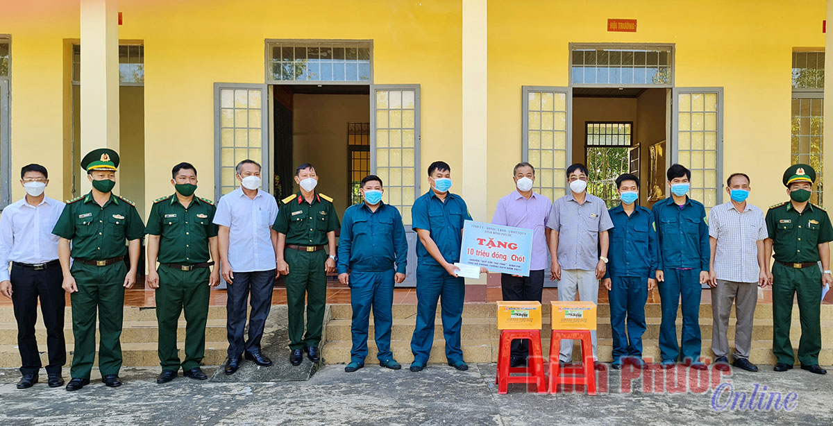 Dịp này, đoàn tặng quà cho 18 tổ chốt quản lý bảo vệ biên giới và phòng chống dịch Covid-19, mỗi chốt gồm 2 phần quà và 10 triệu đồng tiền mặt.