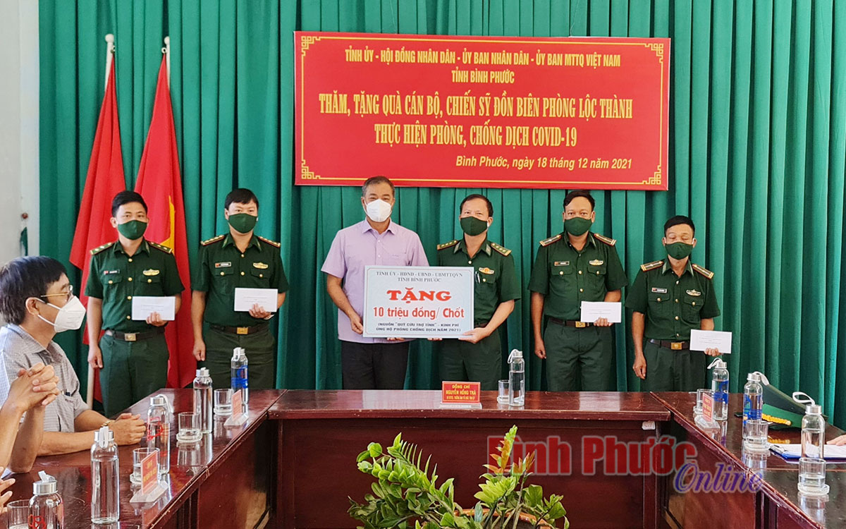 Ủy viên Ban Thường vụ, Trưởng ban Tổ chức Tỉnh ủy Nguyễn Hồng Trà trao quà cho cán bộ, chiến sĩ tổ chốt của Đồn biên phòng Lộc Thiện