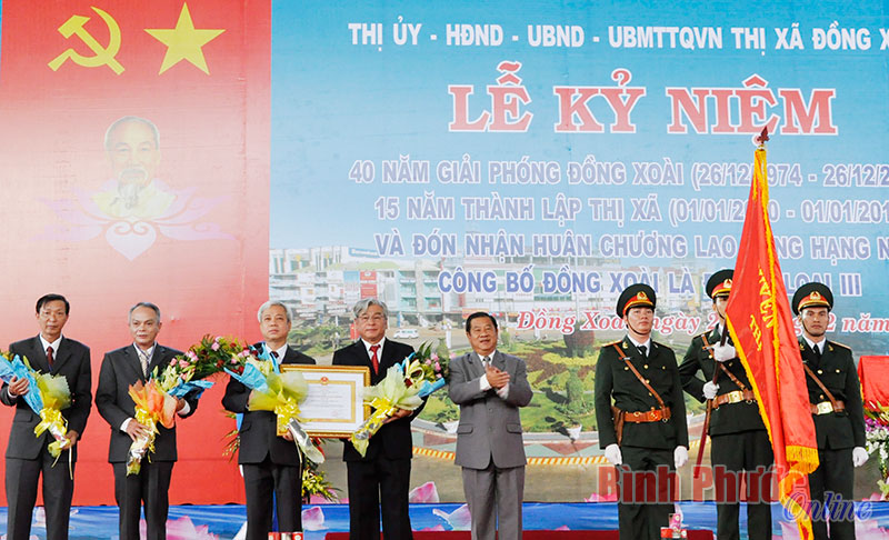 2. Ngày 26-12, Thị ủy, HĐND, UBND, UBMTTQVN thị xã Đồng Xoài tổ chức lễ kỷ niệm 40 năm ngày giải phóng (26-12-1974 - 26-12-2014), 15 năm thành lập thị xã (1-1-2000 - 1-1-2015), đón nhận Huân chương Lao động hạng Nhì và quyết định công nhận là đô thị loại III. Từ năm 2015, thị xã Đồng Xoài - trung tâm chính trị, kinh tế - xã hội của tỉnh tiếp tục phấn đấu trở thành thành phố của tỉnh Bình Phước.