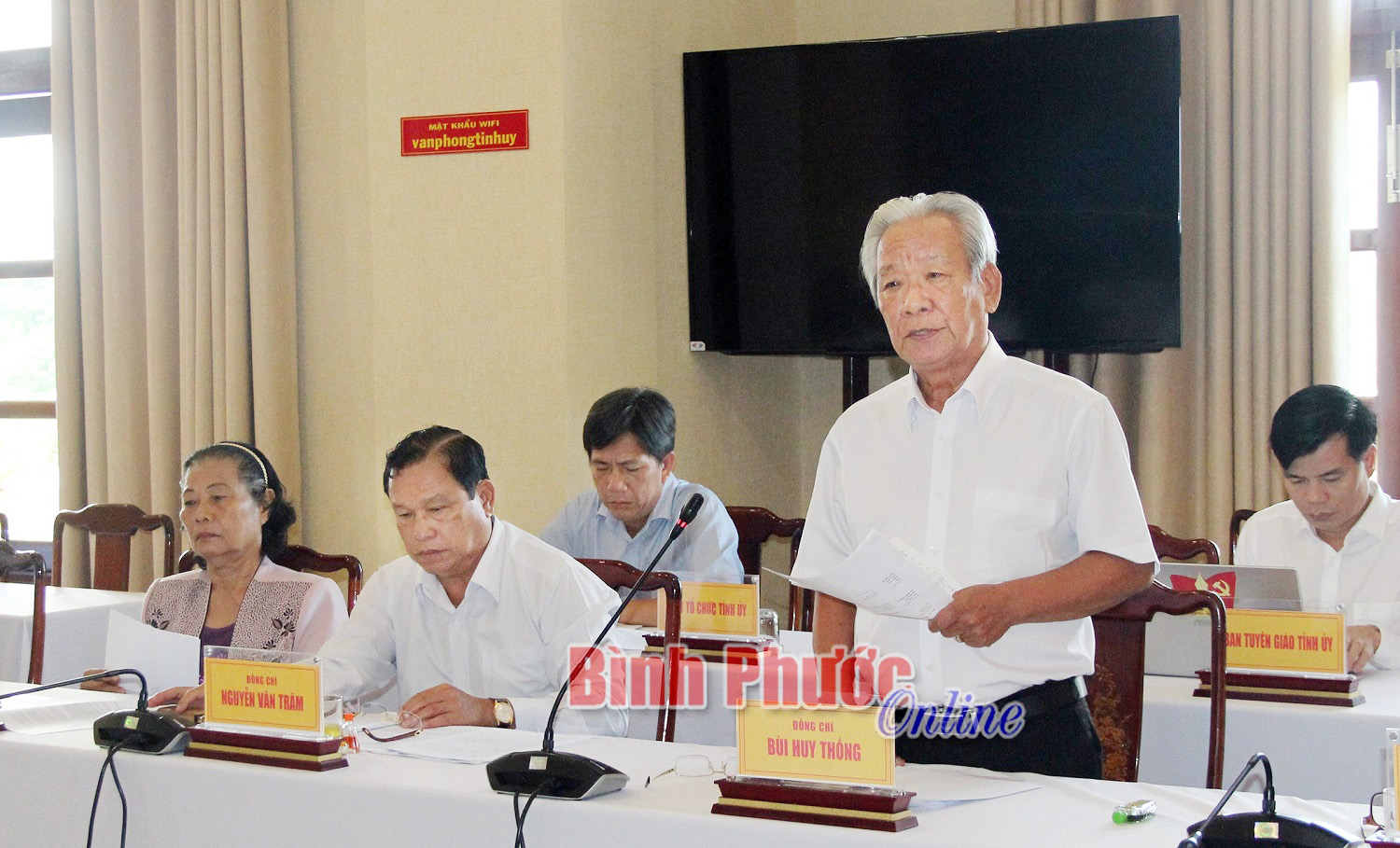 Ông Bùi Huy Thống, nguyên Phó bí thư Tỉnh ủy, nguyên Chủ tịch UBND tỉnh Bình Phước góp ý dự thảo báo cáo chính trị trình Đại hội Đảng bộ tỉnh lần thứ XI, nhiệm kỳ 2020-2025. Ảnh: Minh Luận