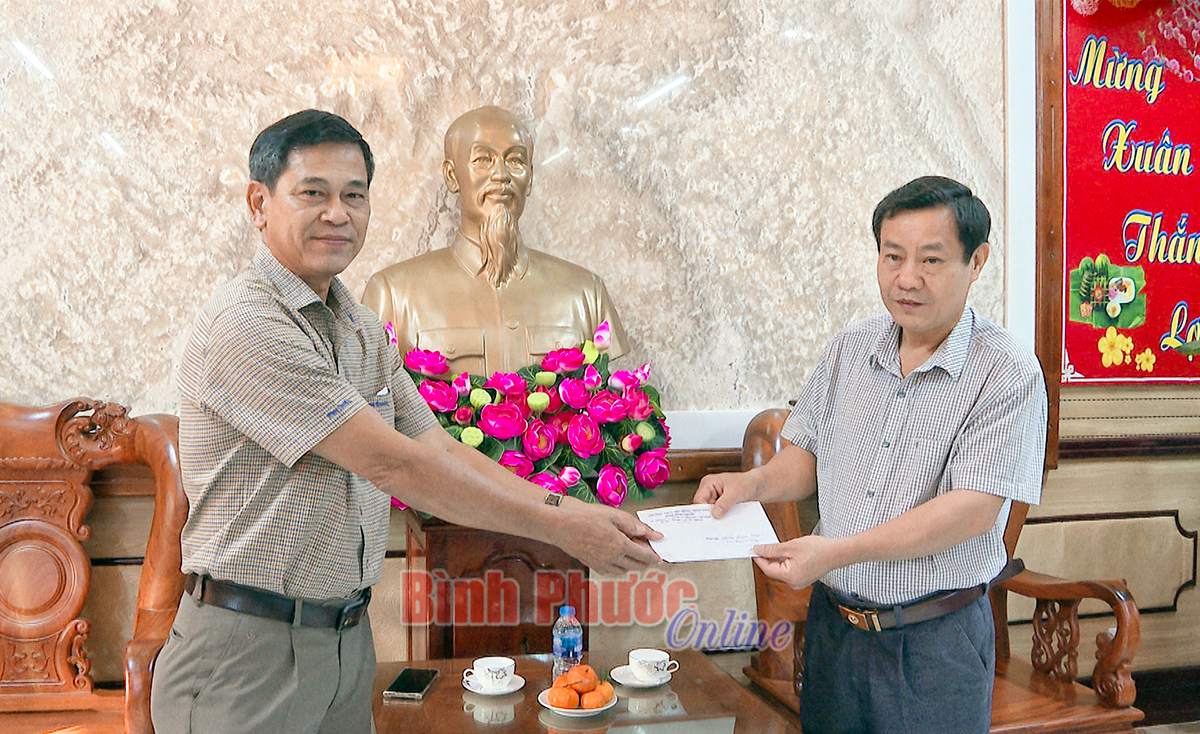 Phó chủ tịch HĐND tỉnh Huỳnh Hữu Thiết (bên trái) thăm, chúc tết Thường trực HĐND thị xã Phước Long