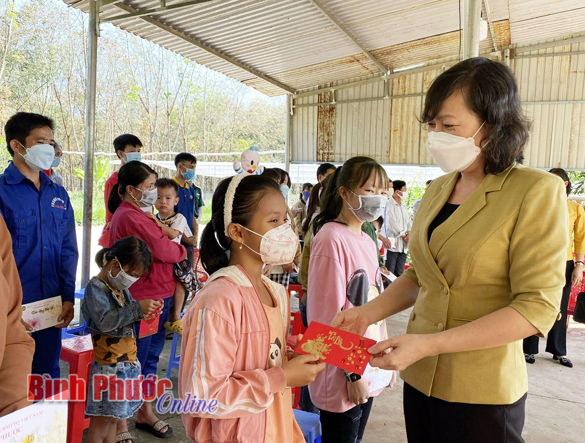 Phó bí thư Thường trực Tỉnh ủy, Chủ tịch HĐND tỉnh Huỳnh Thị Hằng mừng tuổi trẻ em trong điểm dân cư liền kề Thanh Hòa, huyện Bù Đốp