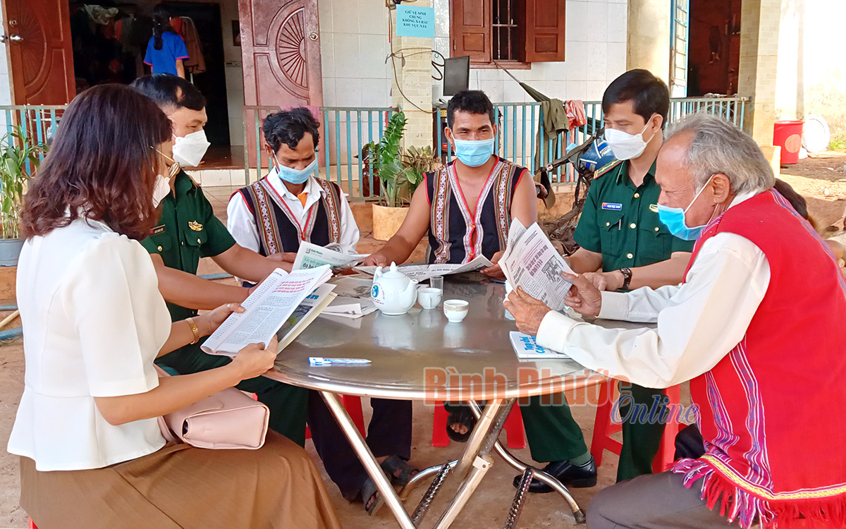 Hệ thống chính trị các cấp trong huyện Bù Đốp không ngừng được củng cố, sức mạnh khối đại đoàn kết toàn dân ngày càng được phát huy, góp phần giữ vững chủ quyền, an ninh biên giới. Trong ảnh: Một buổi sinh hoạt chính trị của cán bộ Đồn biên phòng Bù Đốp với trưởng thôn, người có uy tín thôn Thiện Cư, xã Thiện Hưng - Ảnh: Quang Minh