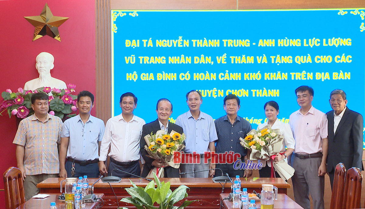 Đại tá Nguyễn Thành Trung đã trao tặng huyện Chơn Thành 50 triệu đồng và tặng 10 triệu đồng cho xã Nha Bích, để tặng quà cho các gia đình có hoàn cảnh khó khăn trên địa bàn. Anh hùng lực lượng vũ trang nhân dân Nguyễn Thành Trung mong muốn, Đảng bộ, chính quyền và nhân dân huyện Chơn Thành tiếp tục phát triển mạnh về kinh tế - xã hội, đặc biệt là phát triển công nghiệp, đưa Chơn Thành trở thành thị xã trong thời gian sớm nhất.