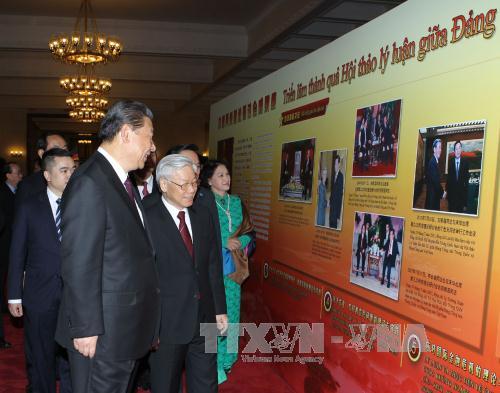 * Trước đó, Tổng Bí thư Nguyễn Phú Trọng và Tổng Bí thư, Chủ tịch Trung Quốc Tập Cận Bình đã tham quan trưng bày một số hình ảnh và tư liệu về kết quả 10 lần Hội thảo lý luận giữa hai Đảng. Từ năm 2003 đến năm 2014, hai Đảng đã lần lượt tiến hành trao đổi lý luận và kinh nghiệm thực tiễn về Chủ nghĩa xã hội và kinh tế thị trường; Xây dựng Đảng cầm quyền; Phát triển khoa học, hài hòa trong xây dựng kinh tế; Những vấn đề lý luận và thực tiễn về nông nghiệp, nông thôn, nông dân; Lý luận và thực tiễn về ứng phó với cuộc khủng hoảng tài chính toàn cầu; Thúc đẩy xây dựng văn hóa trong điều kiện kinh tế thị trường, hội nhập quốc tế; Làm tốt công tác quần chúng trong tình hình mới; Đổi mới mô hình tăng trưởng kinh tế; Xây dựng Đảng trong sạch, vững mạnh trong tình hình mới và Xây dựng nhà nước pháp quyền xã hội chủ nghĩa. Các cuộc hội thảo lý luận đã bám sát các vấn đề cấp bách đặt ra cho hai Đảng và góp phần quan trọng làm phong phú thêm kho tàng lý luận và kinh nghiệm thực tiễn cho mỗi Đảng trong quá trình lãnh đạo đất nước.