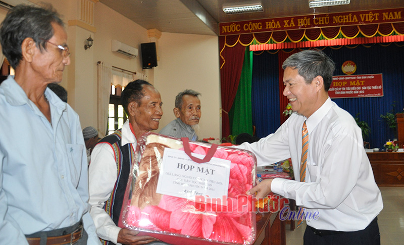 Chủ tịch UBMTTQ Việt Nam tỉnh Huỳnh Quang Tiên tặng quà các già làng, người có uy tín tiêu biểu trong đồng bào các dân tộc thiểu số tại buổi gặp mặt với lãnh đạo tỉnh ngày 25-3-2015 - Ảnh: Tuyết Ly