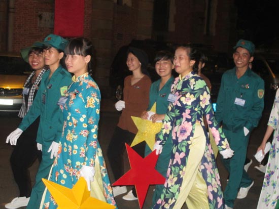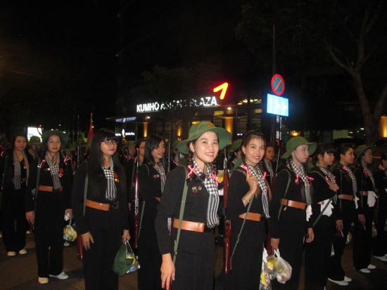 Đội hình nữ du kích Củ Chi tham gia diễu binhCác đội cựu chiến binh, sinh viên, học sinh, du kích Củ Chi, dân quân tự vệ… đã chỉnh tề trang phục sẵn sàng tham gia diễu binh. Đúng 5g sáng, các lực lượng tham gia diễu binh, diễu hành tập dợt lại lần cuối, để bảo đảm các nội dung đúng với kịch bản đã duyệt.