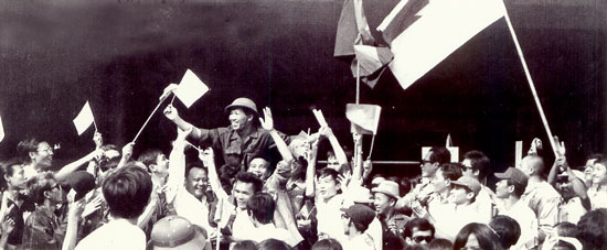 Người dân thành phố Sài Gòn mừng chiến thắng cùng các anh bộ đội giải phóng, ngày 30-4-1975.