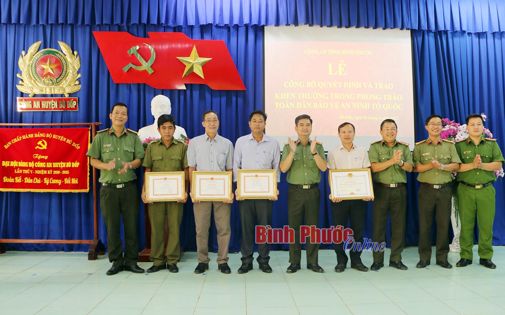 Lãnh đạo Phòng Xây dựng phong trào bảo vệ ANTQ Công an tỉnh trao khen thưởng cho các tập thể, cá nhân có thành tích xuất sắc tại Công an huyện Bù Đốp