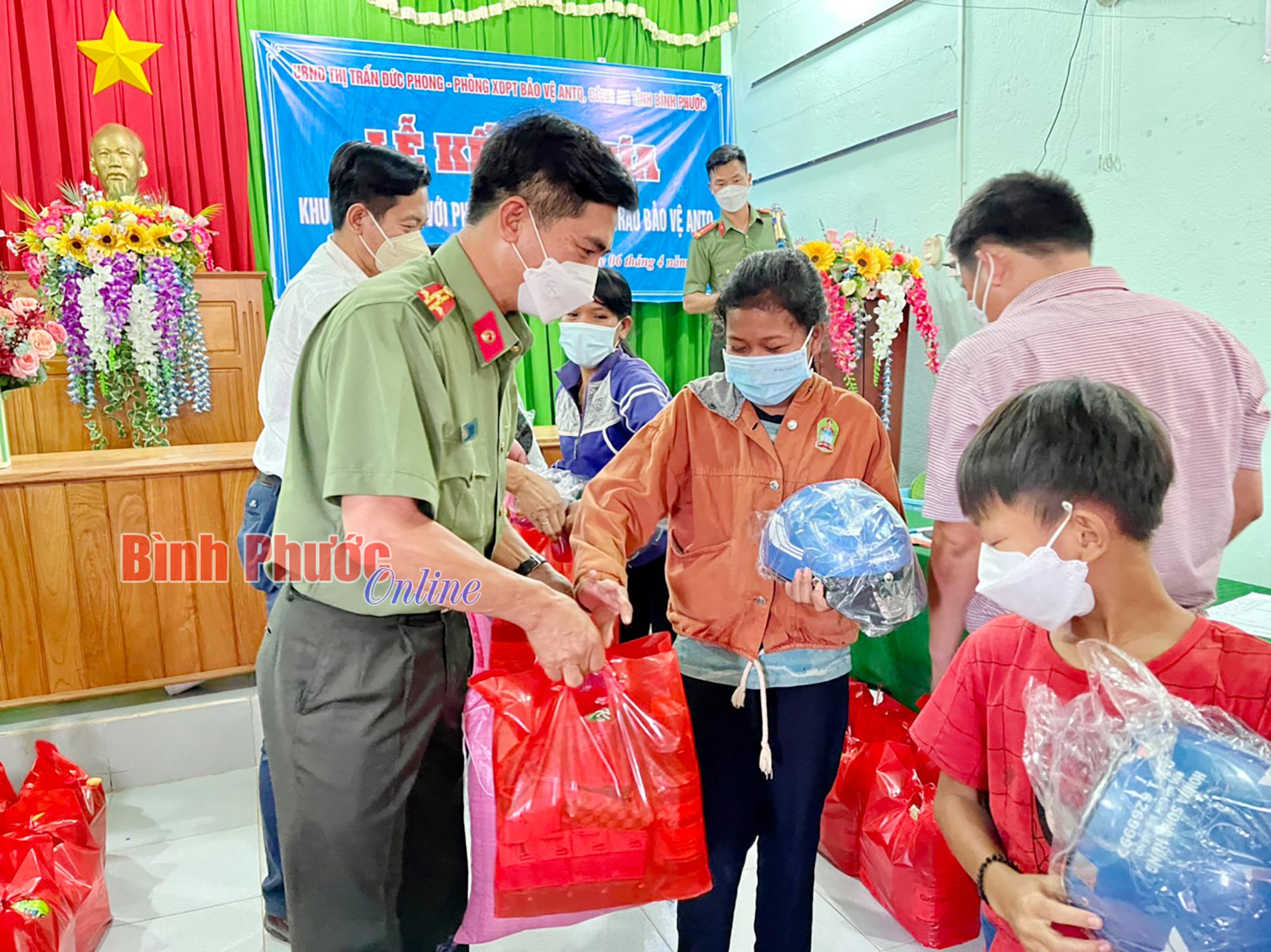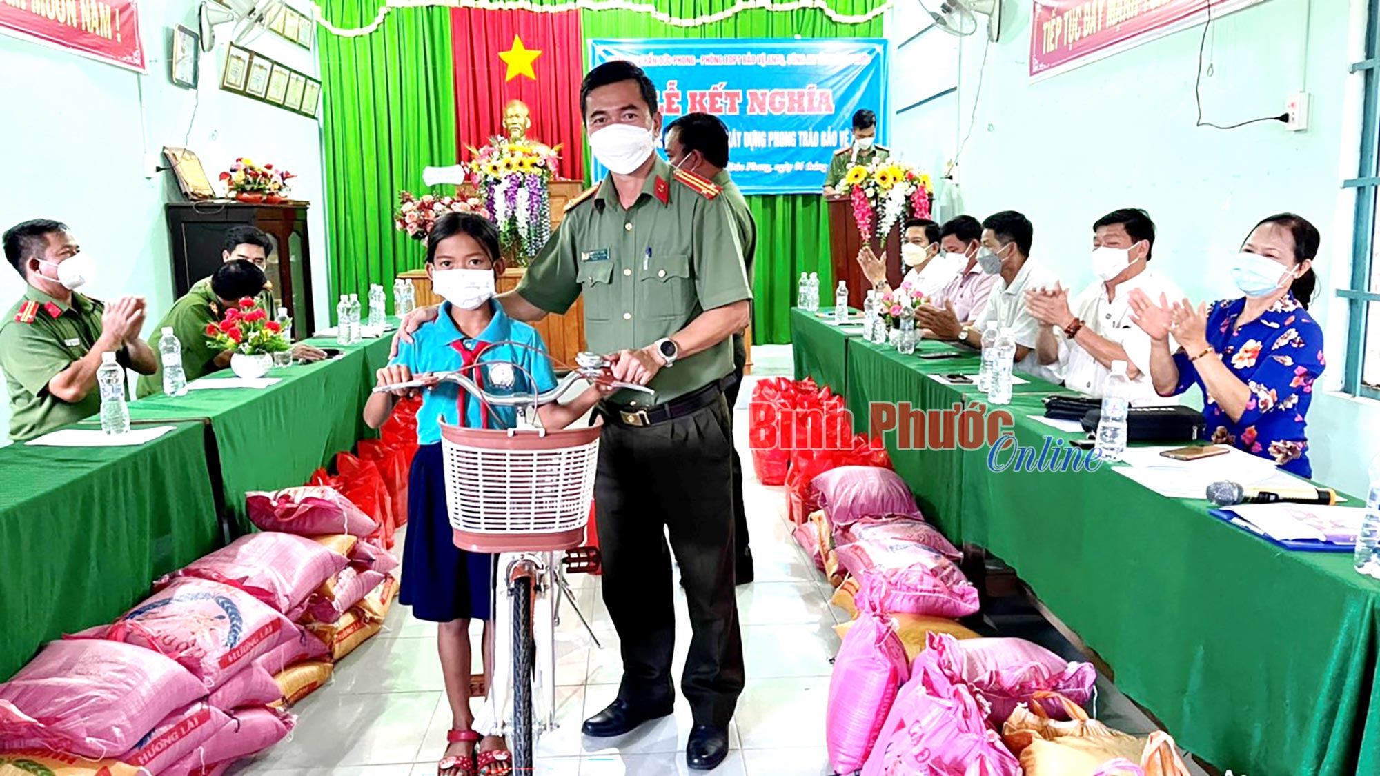 Lãnh đạo Phòng Xây dựng phong trào bảo vệ ANTQ Công an tỉnh trao tặng xe đạp cho học sinh nghèo vượt khó và tặng quà cho đồng bào nghèo tại ấp Bù Môn, khu phố Đức Lợi, thị trấn Đức Phong, huyện Bù Đăng