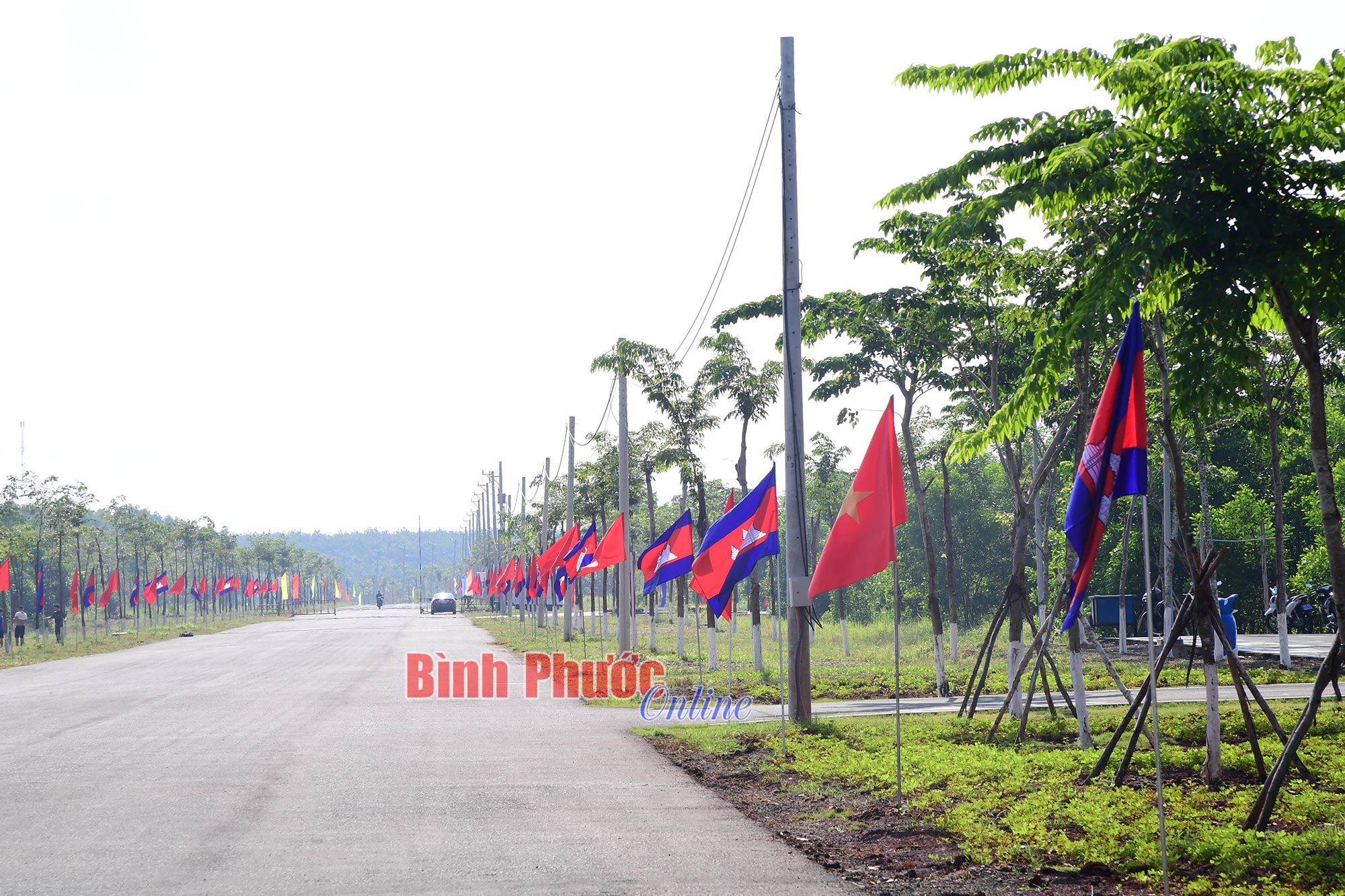 Quốc kỳ của 2 nước Việt Nam - Campuchia được cắm xen kẽ nhau, dọc 2 bên đường tại khu vực X16