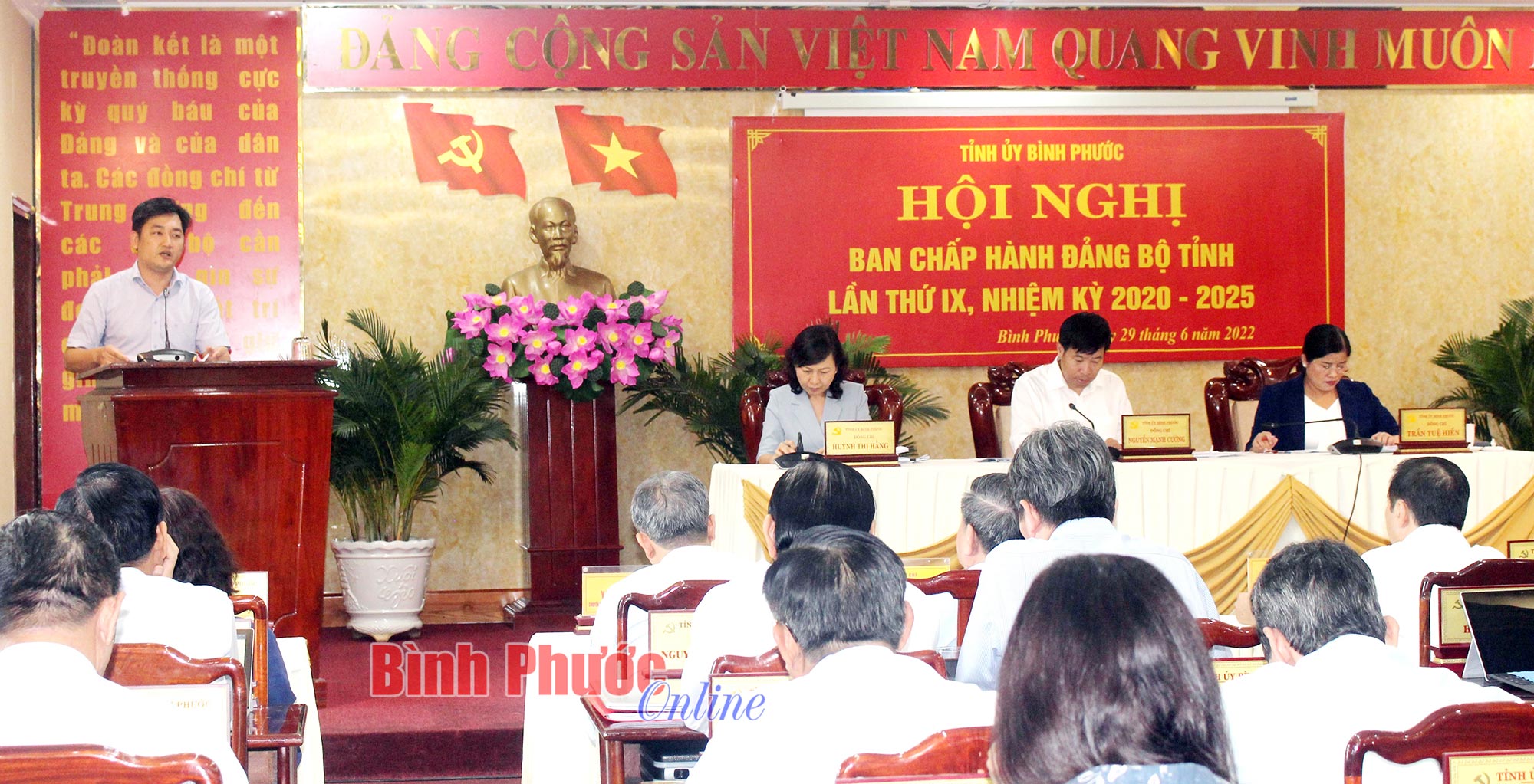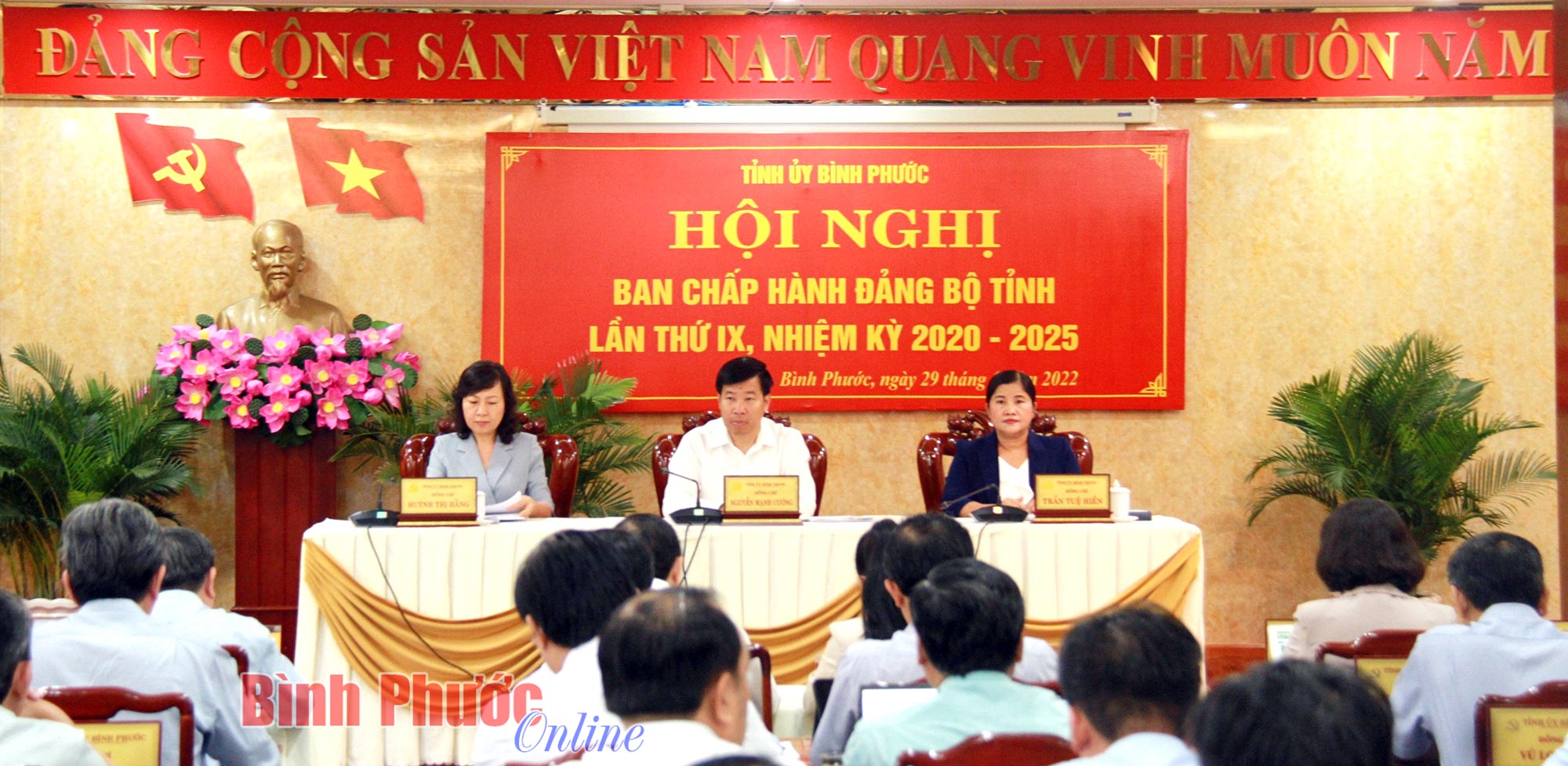 Kinh tế Bình Phước tăng trưởng khá, đứng thứ 2 vùng Đông Nam BộBPO - Như tin đã đưa, sáng nay 29-6, Tỉnh ủy Bình Phước tổ chức hội nghị Ban Chấp hành Đảng bộ tỉnh lần thứ IX, nhiệm kỳ 2020-2025. Ủy viên Trung ương Đảng, Bí thư Tỉnh ủy Nguyễn Mạnh Cường; Phó bí thư Thường trực Tỉnh ủy, Chủ tịch HĐND tỉnh Huỳnh Thị Hằng; Phó bí thư Tỉnh ủy, Chủ tịch UBND tỉnh Trần Tuệ Hiền đồng chủ trì hội nghị.