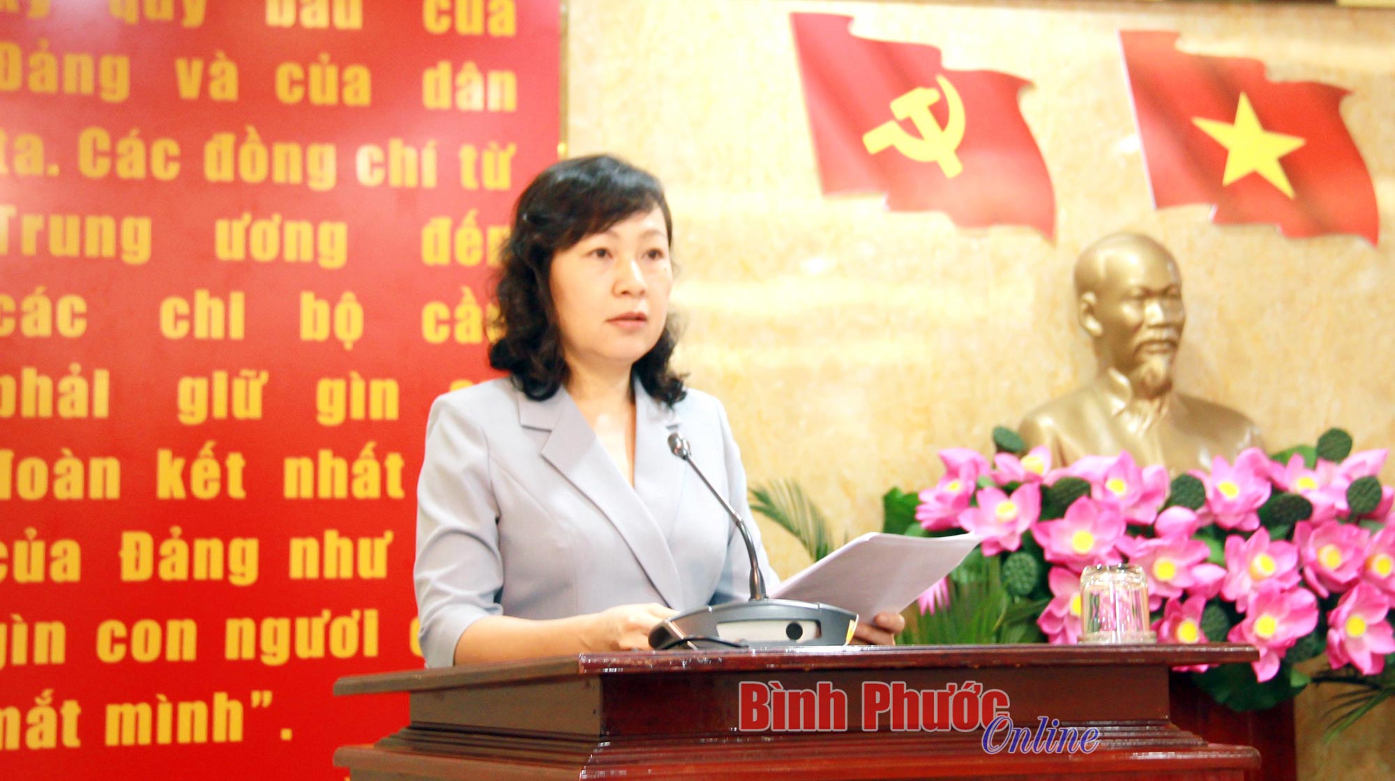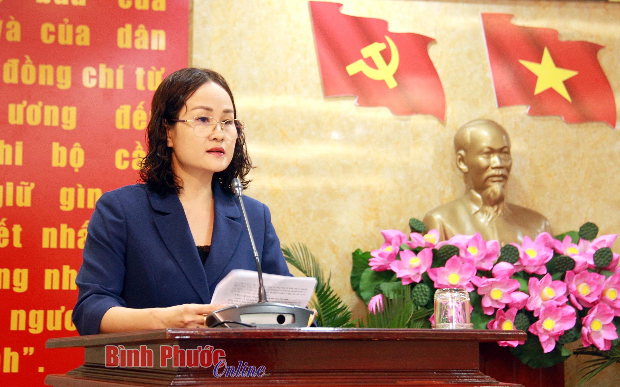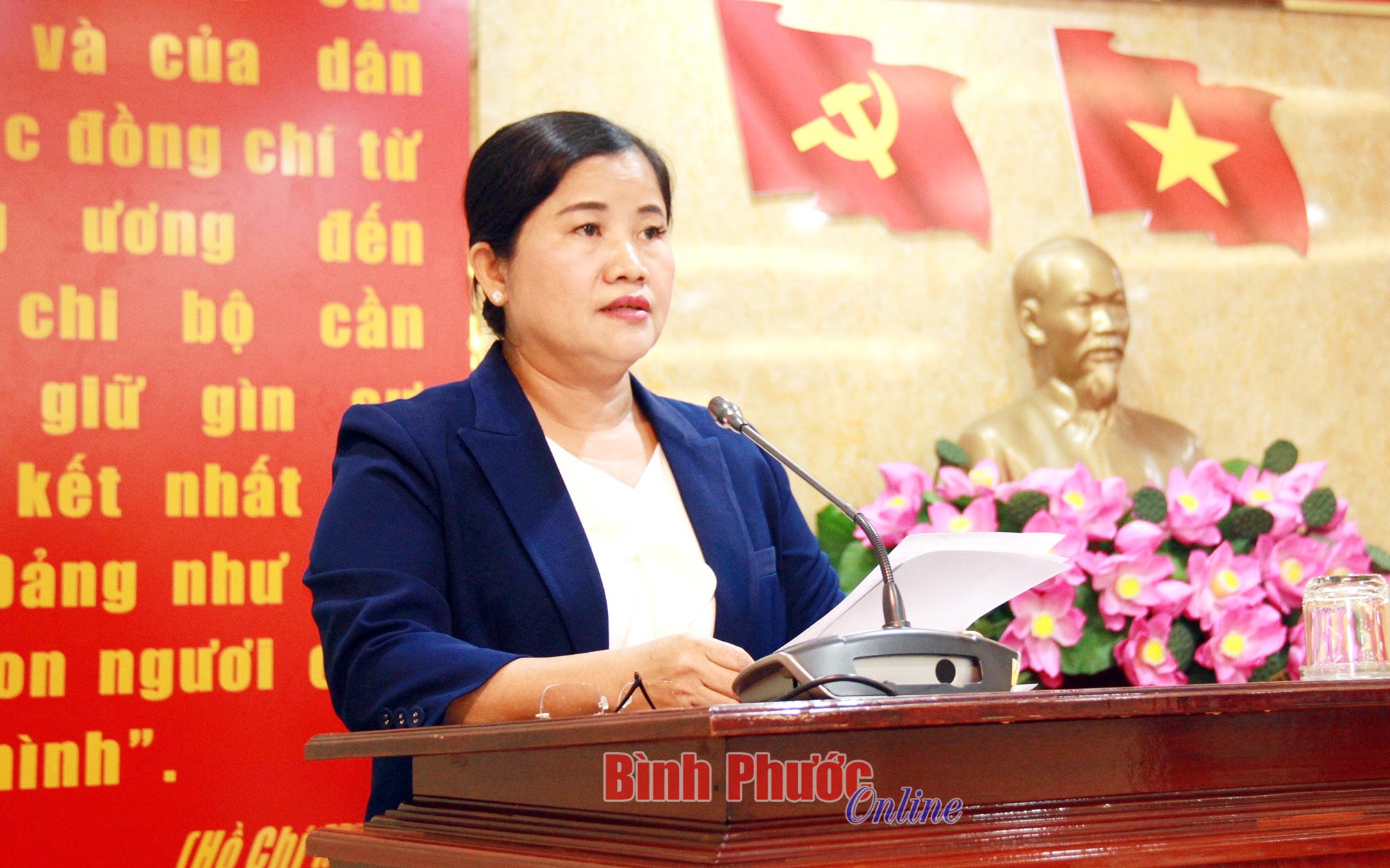 Tỉnh ủy viên, Bí thư Huyện ủy Hớn Quản Quách Thị Ánh phát biểu về tình hình thực hiện các chỉ tiêu kinh tế - xã hội 6 tháng đầu năm của Hớn Quản, tình trạng giải ngân vốn đầu tư công tại địa phương đạt thấp và diễn biến cũng như ảnh hưởng của dịch tả heo châu Phi đối với Hớn Quản.