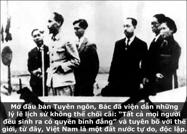 Chủ tịch Hồ Chí Minh đọc ''Tuyên ngôn Độc lập'', tuyên bố sự ra đời của nước Việt Nam Dân chủ Cộng hòa ngày 2-9-1945.