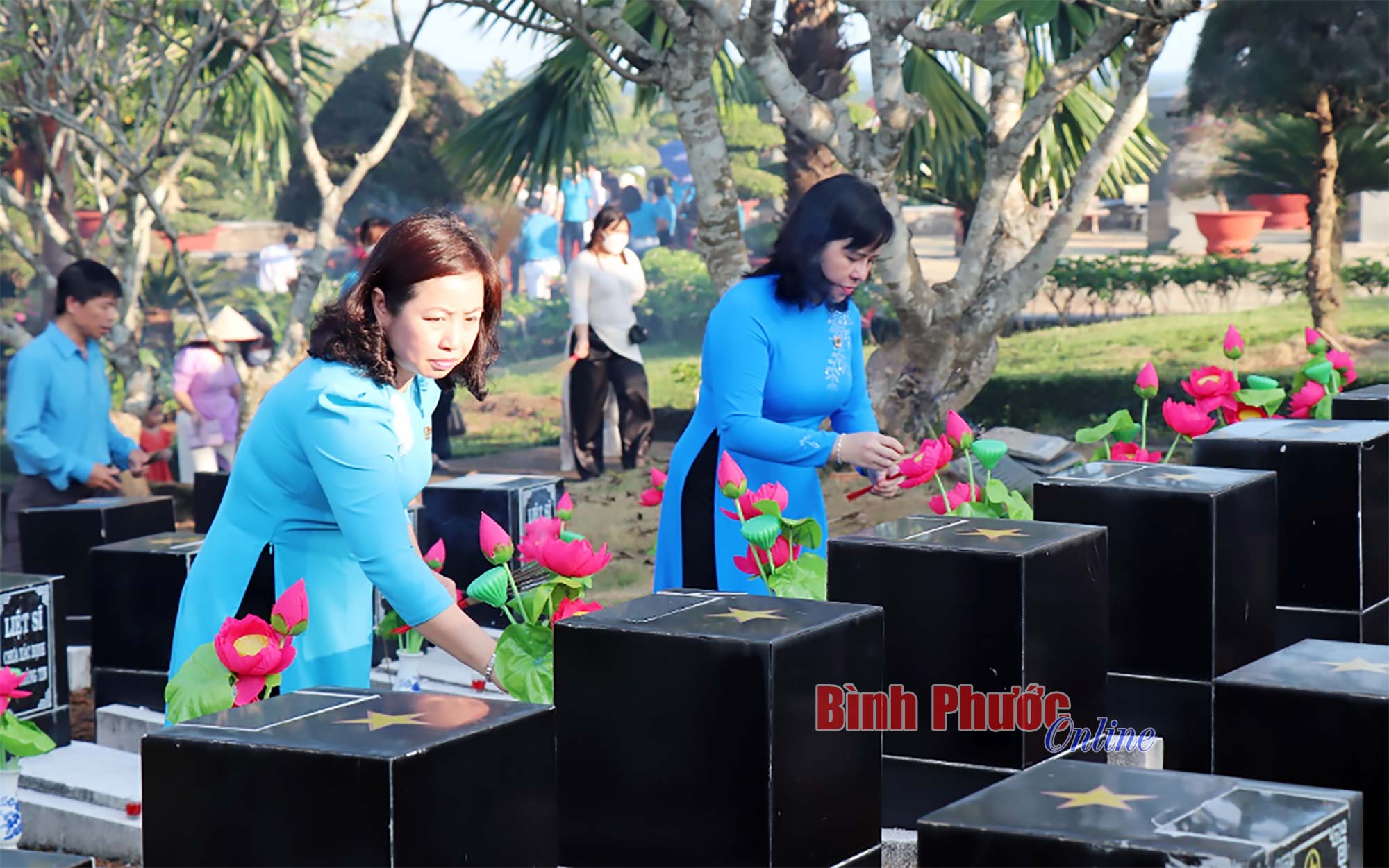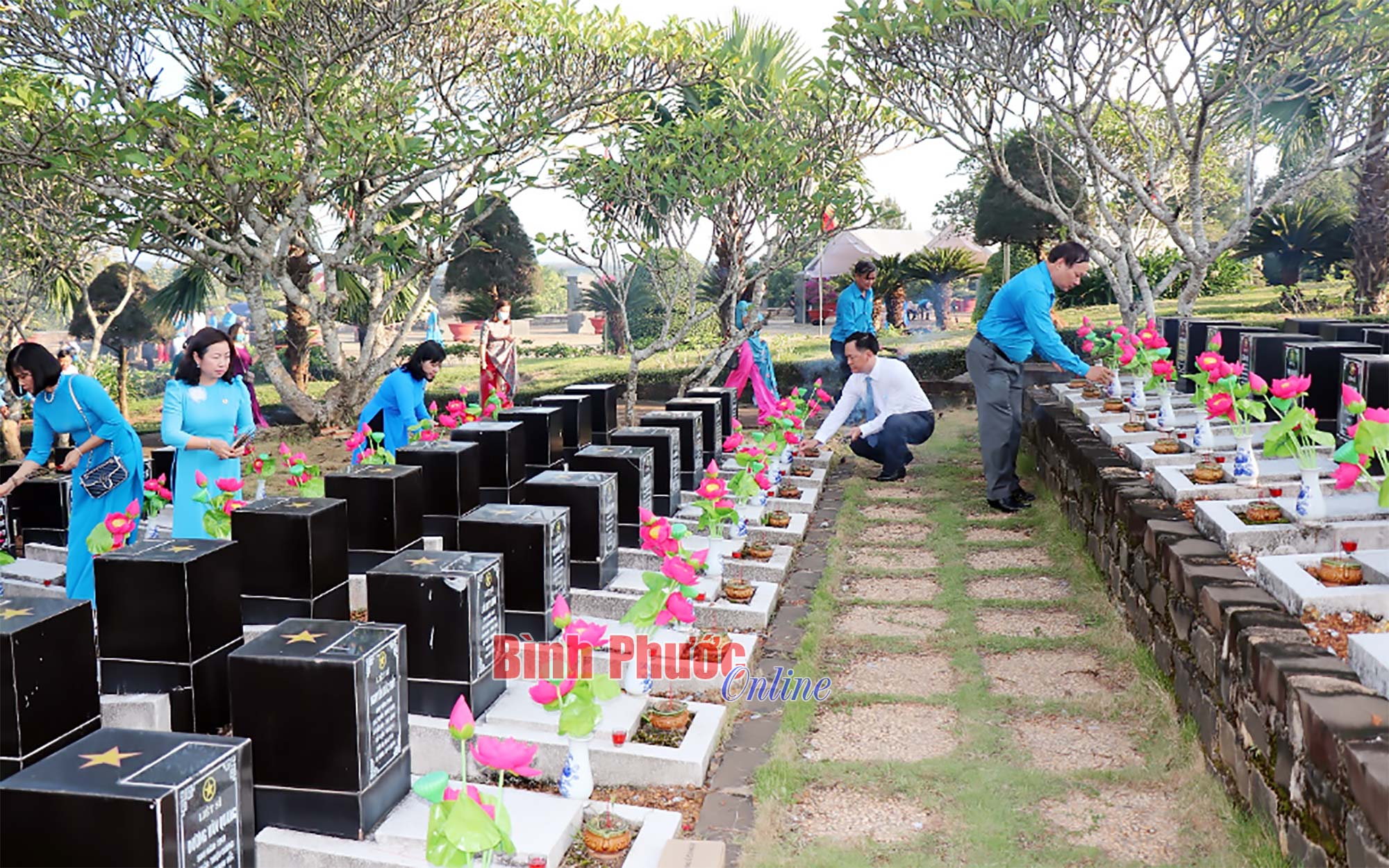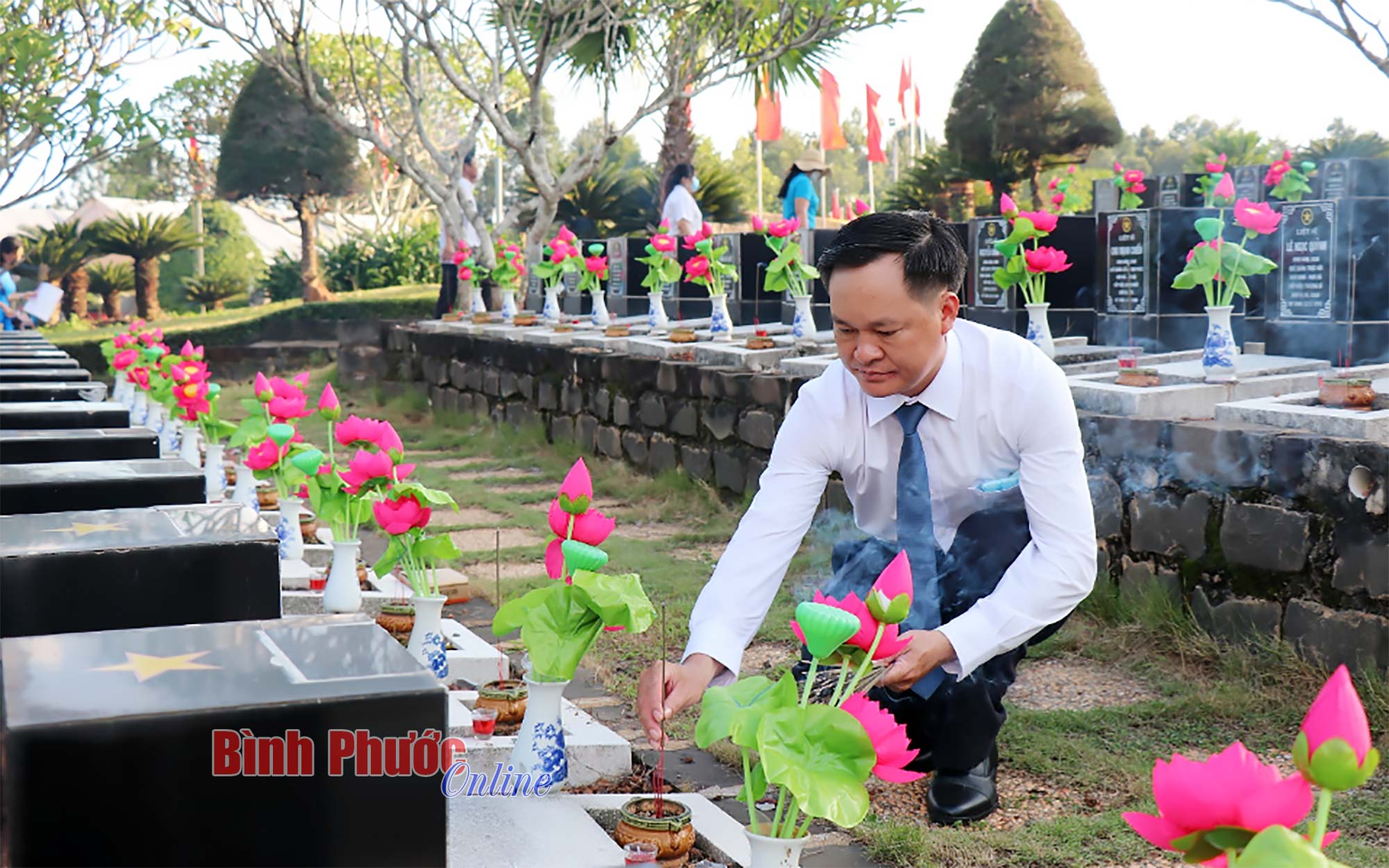 Để tưởng nhớ công lao của các anh hùng liệt sĩ đã cống hiến, hy sinh cho Tổ quốc, đoàn công tác và lãnh đạo tỉnh cùng các công đoàn viên đã dành 1 phút mặc niệm. Sau đó, đoàn đã dâng hương lên đài liệt sĩ và thắp những nén hương lên từng phần mộ tại Nghĩa trang liệt sĩ tỉnh.
