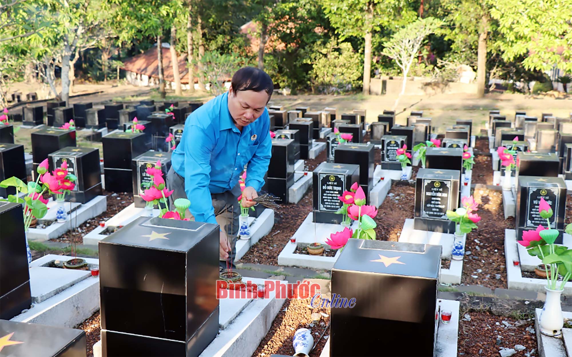 Phó trưởng Ban Tuyên giáo Tỉnh ủy Mạc Đình Huấn thắp hương lên phần mộ các liệt sĩ