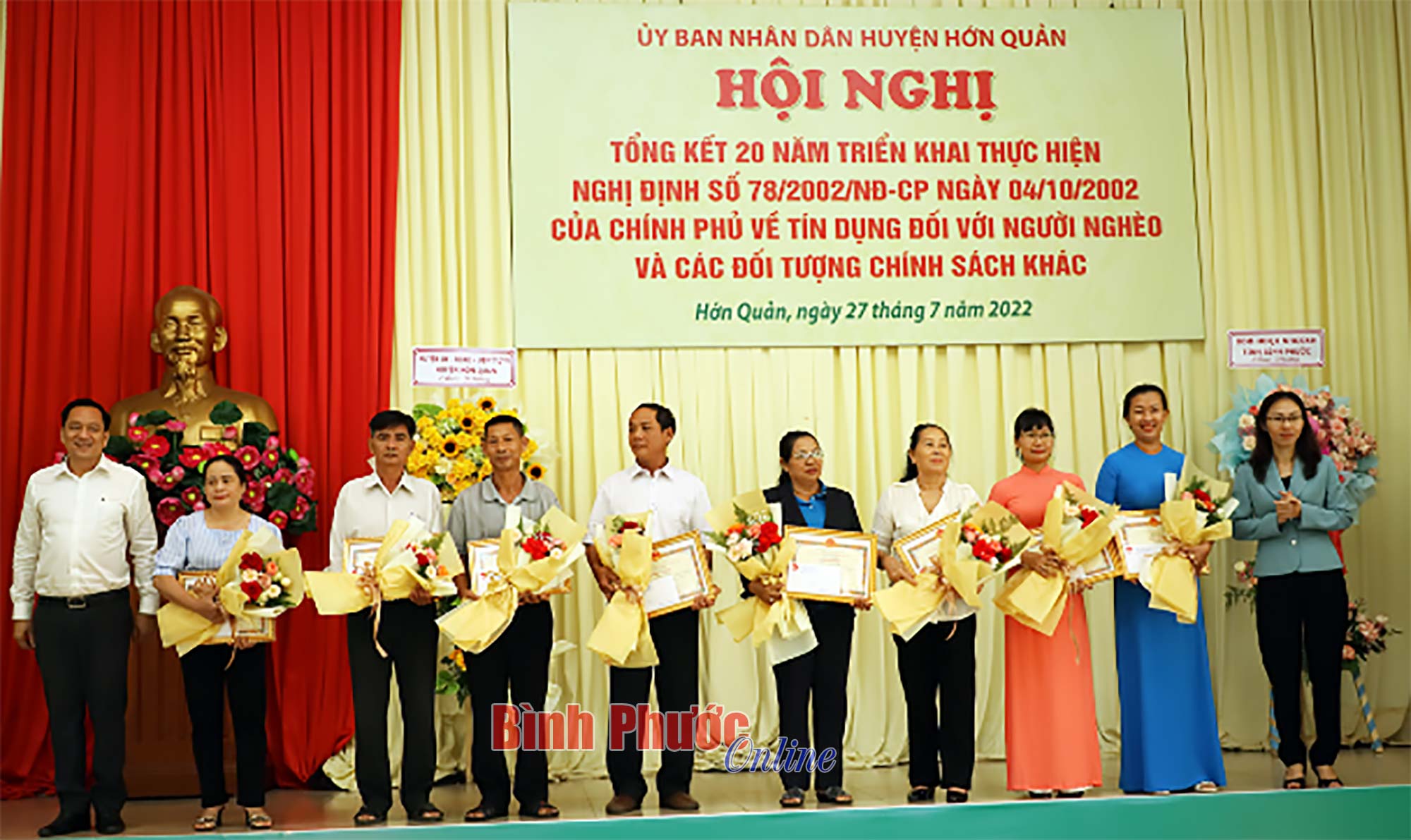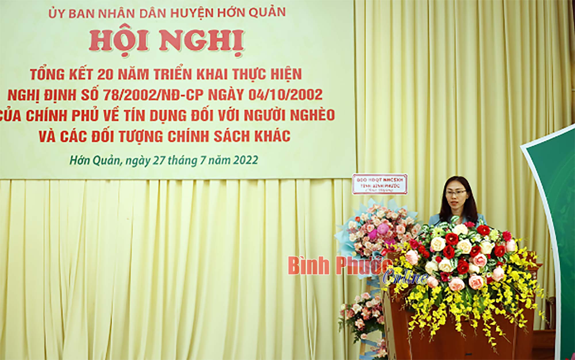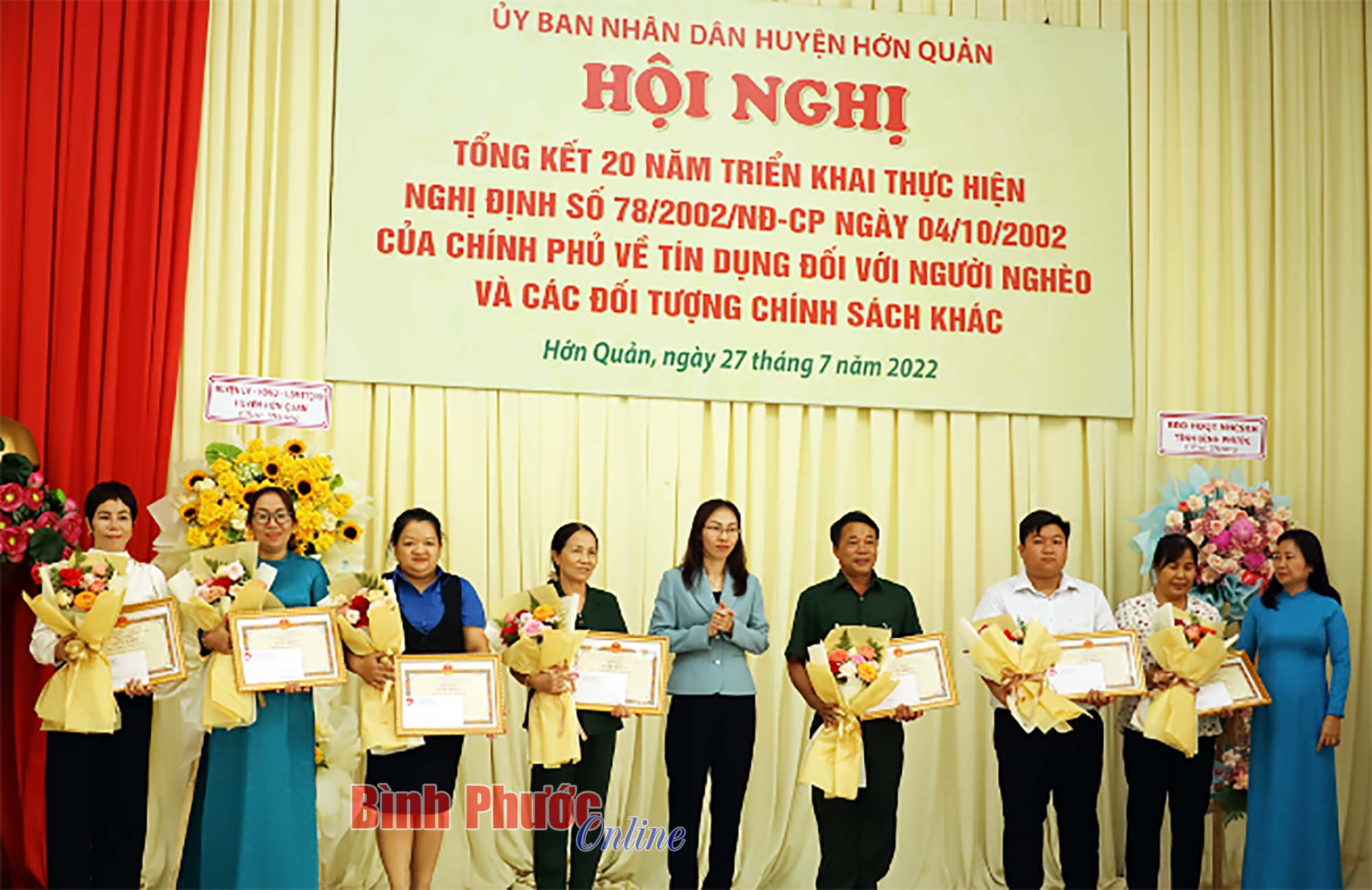 Qua 20 năm thực hiện tín dụng chính sách theo Nghị định 78/2002/NĐ-CP, huyện Hớn Quản đã tập trung nguồn lực tín dụng qua Ngân hàng Chính sách xã hội cho vay được 45.432 lượt hộ nghèo và các đối tượng chính sách khác, với doanh số cho vay 735.563 triệu đồng, doanh số thu nợ 405.679 tỷ đồng.