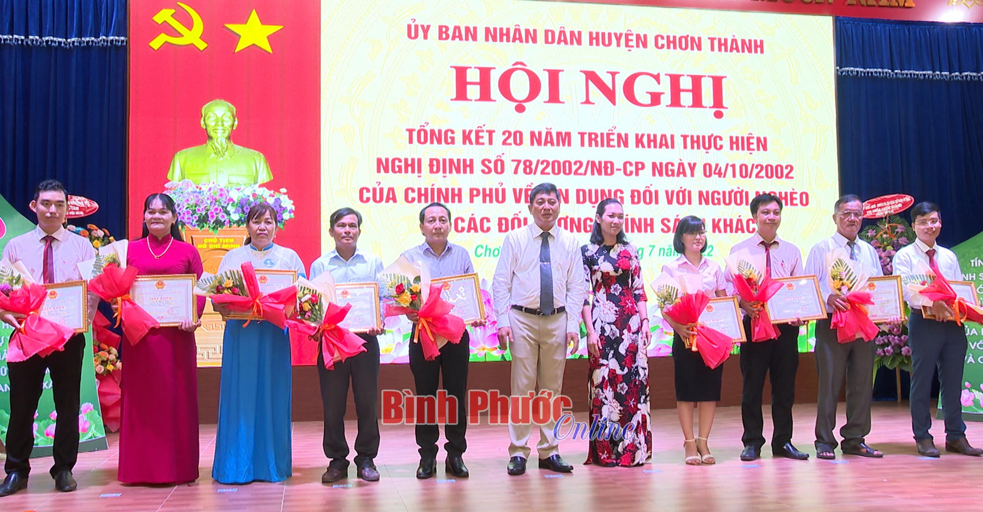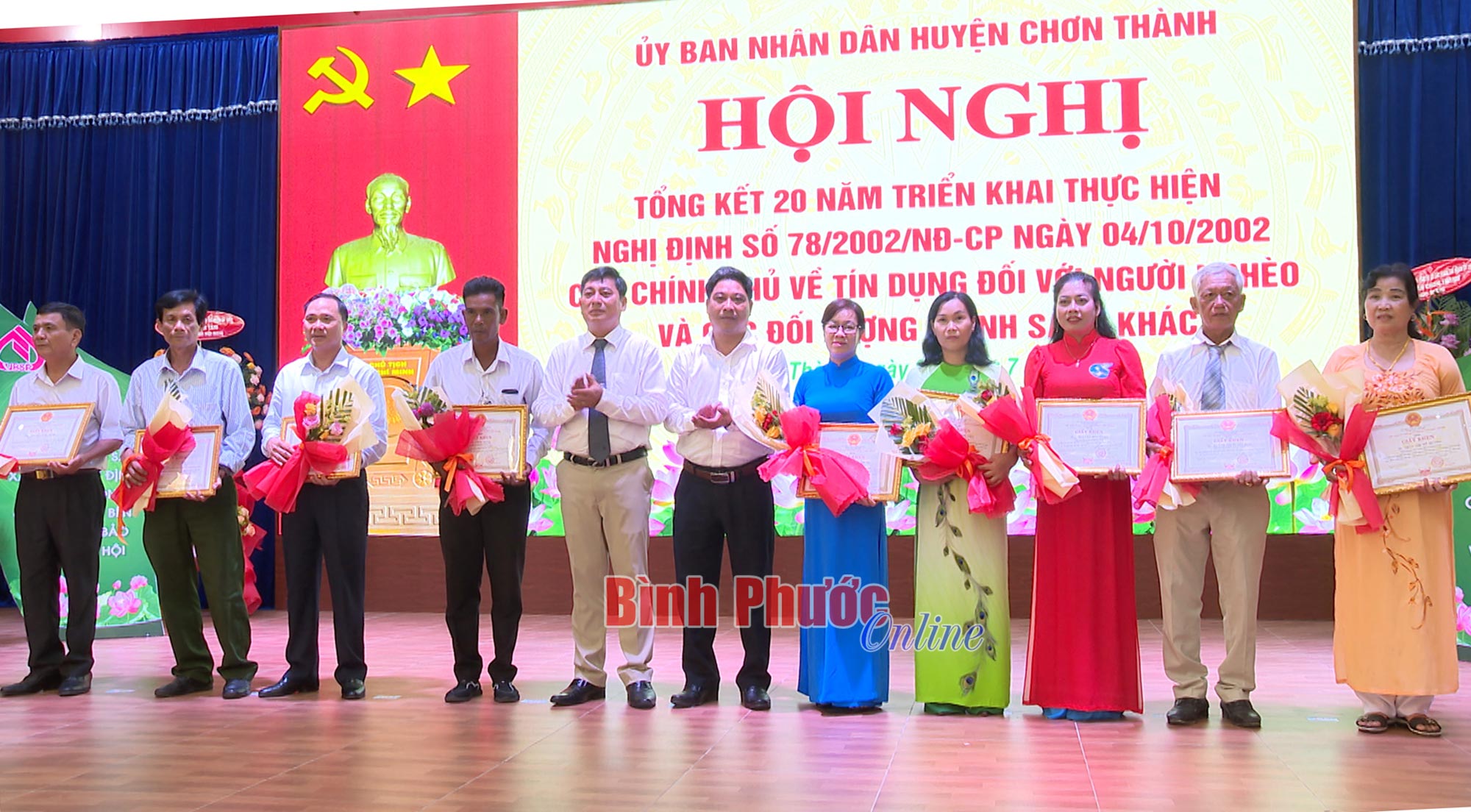 Qua 20 năm triển khai tín dụng chính sách theo Nghị định số 78 của Chính phủ đã khẳng định được vai trò của chính sách tín dụng ưu đãi, sự quan tâm của Đảng và Nhà nước đối với người nghèo và các đối tượng chính sách khác, bảo đảm an sinh xã hội trên địa bàn huyện Chơn Thành. Kết quả trong 20 năm qua, huyện Chơn Thành đã tập trung nguồn lực tín dụng qua NHCSXH cho vay được 40.196 lượt hộ nghèo và các đối tượng chính sách khác, với doanh số cho vay đạt 793 tỷ 953 triệu đồng, doanh số thu nợ đạt 505.127 triệu đồng. Tổng dư nợ 11 chương trình tín dụng chính sách đến 30-6-2022 đạt 262 tỷ 859 triệu đồng, với 5.112 hộ nghèo và các đối tượng chính sách khác đang vay vốn, dư nợ bình quân 51 triệu đồng/khách hàng.