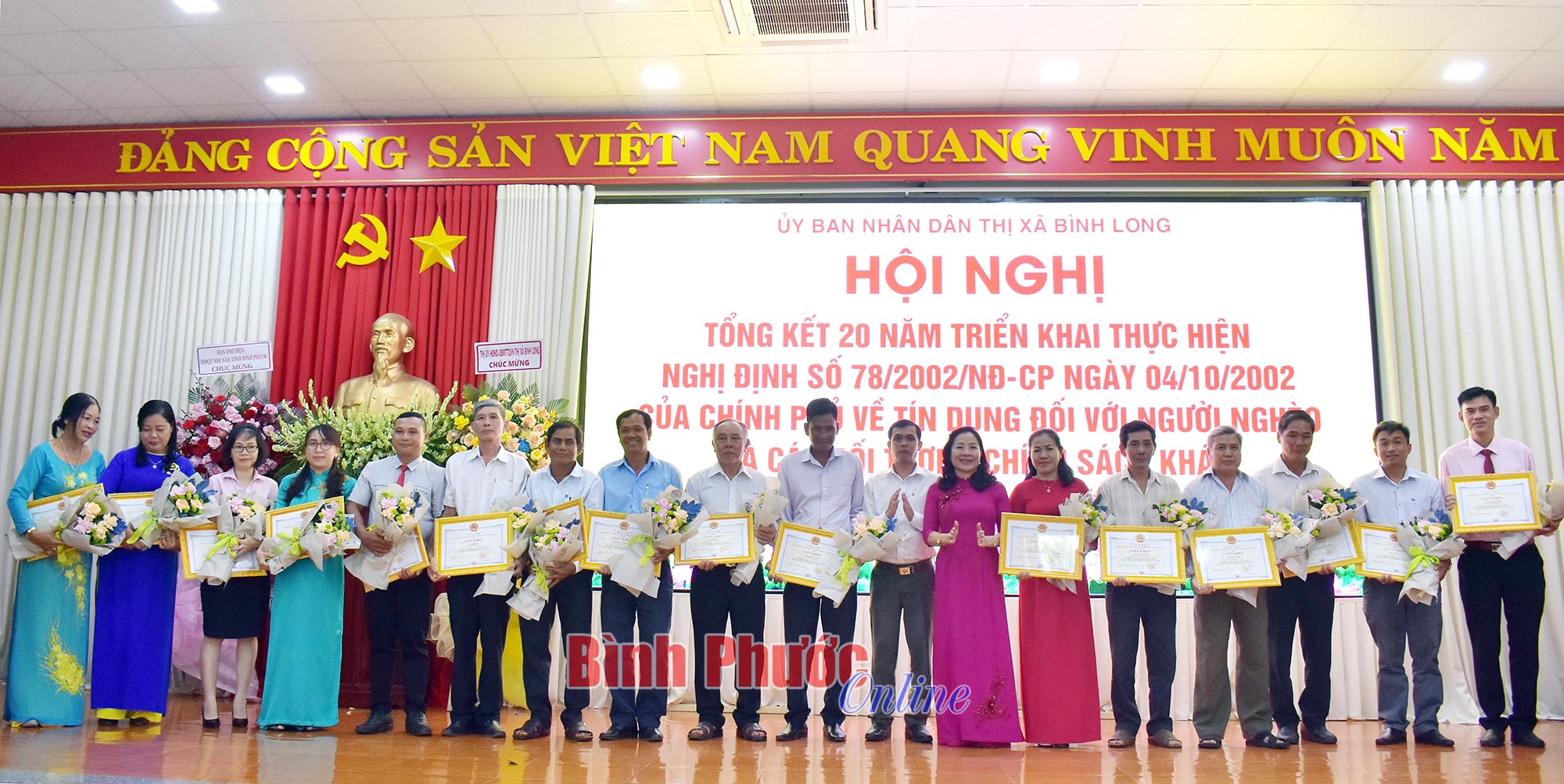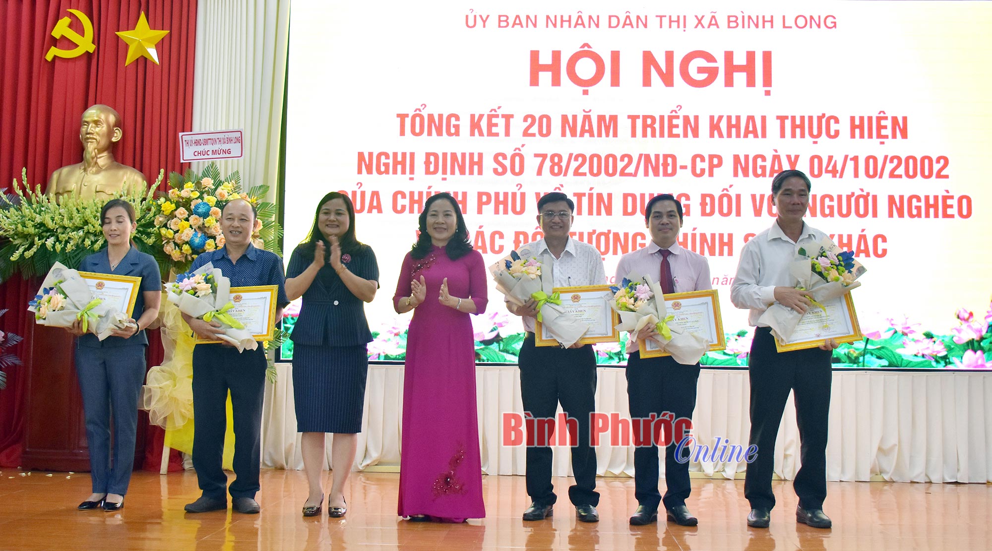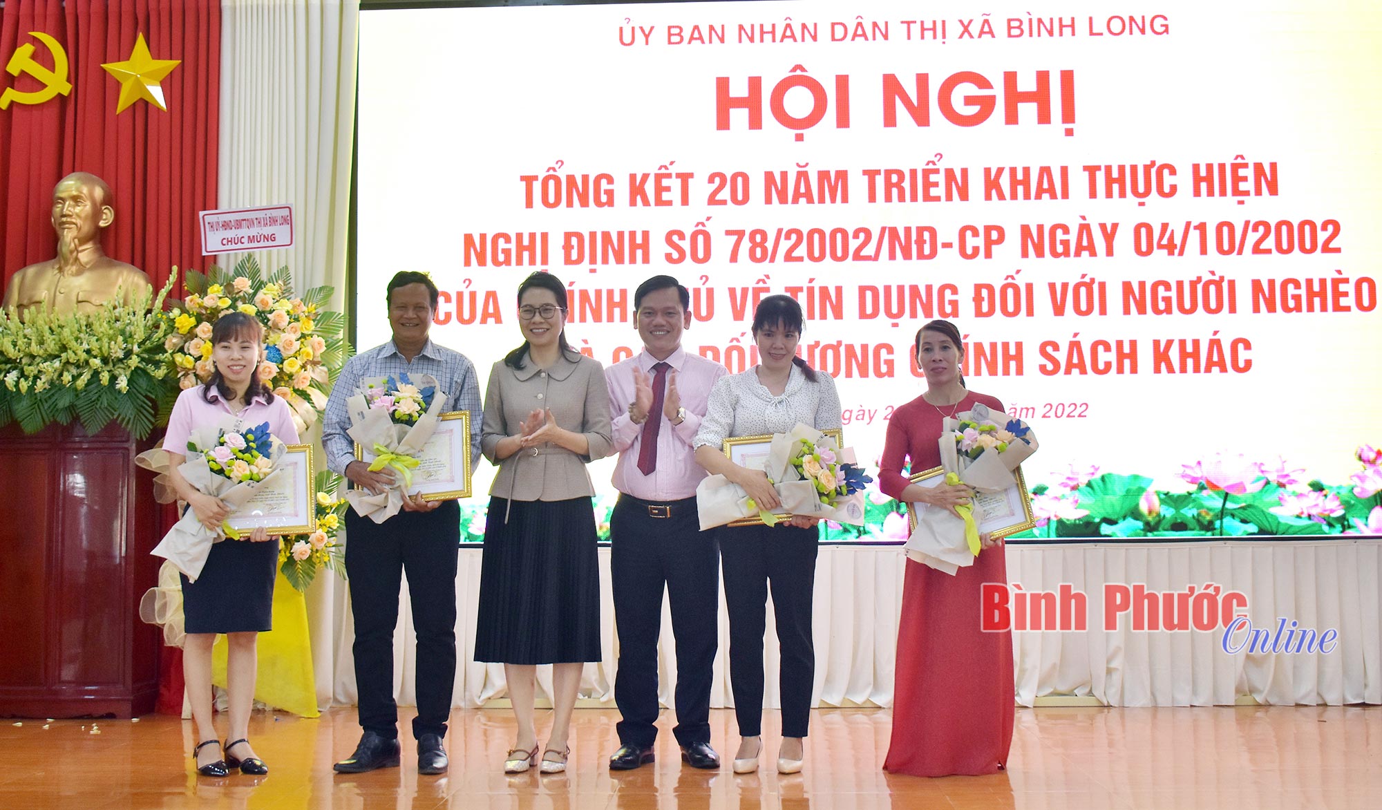 Dịp này, 5 tập thể và 20 cá nhân có nhiều thành tích trong triển khai chính sách tín dụng ưu đãi đối với hộ nghèo và các đối tượng chính sách khác theo Nghị định số 78/2002/NĐ-CP của Chính phủ đã được Tổng giám đốc Ngân hàng CSXH và UBND thị xã Bình Long tặng bằng khen, giấy khen.