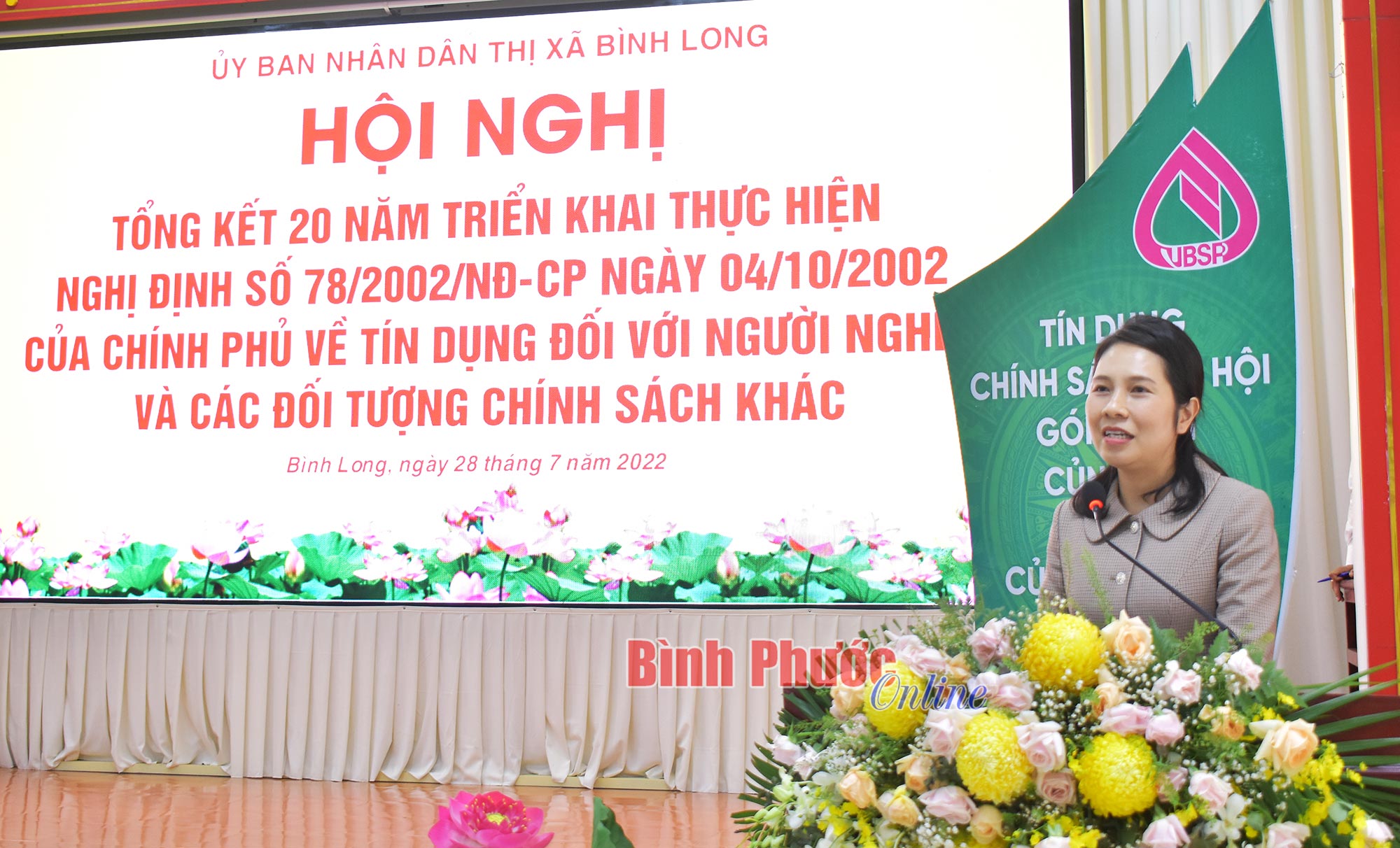 Qua 20 năm thực hiện chính sách tín dụng ưu đãi đối với hộ nghèo và các đối tượng chính sách khác theo Nghị định số 78/2002/NĐ-CP của Chính phủ trên địa bàn thị xã Bình Long, đã thu được nhiều kết quả nổi bật, huy động được các nguồn lực tài chính để tạo lập nguồn vốn, tổ chức thực hiện hiệu quả các chương trình tín dụng chính sách, góp phần thực hiện mục tiêu giảm nghèo bền vững, đảm bảo an sinh xã hội, ổn định chính trị, phát triển kinh tế - xã hội trên địa bàn.