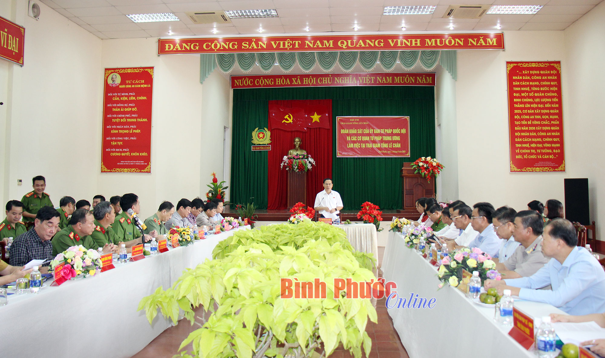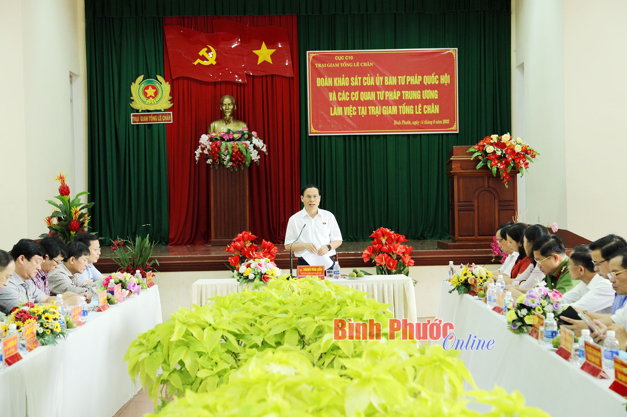 Phát biểu tại buổi làm việc, Phó chủ nhiệm Ủy ban Tư pháp Hoàng Văn Liên, Trưởng đoàn khảo sát đánh giá cao công tác chuẩn bị của Trại giam Tống Lê Chân. Ghi nhận kết quả đạt được trên các mặt công tác và các kiến nghị của trại giam tại buổi làm việc, Phó chủ nhiệm Ủy ban Tư pháp Hoàng Văn Liên yêu cầu đơn vị tiếp thu các ý kiến của đoàn khảo sát để bổ sung vào báo cáo. Mội số nội dung liên quan khác sẽ tiếp tục báo cáo thêm trong chương trình làm việc ngày mai (17-8) với UBND tỉnh Bình Phước.