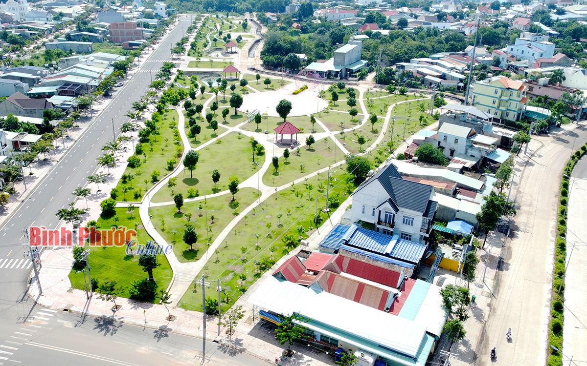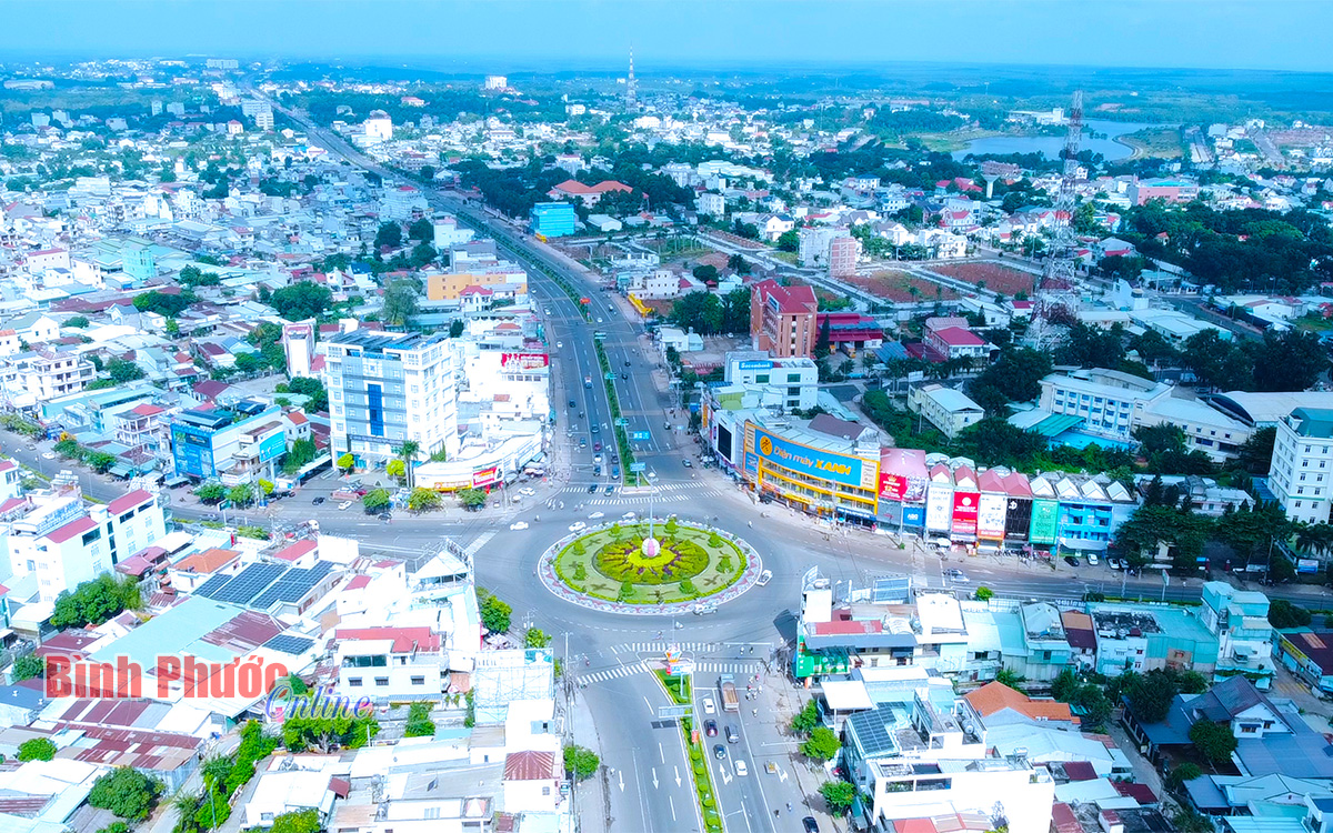 Thành phố Đồng Xoài trên con đường trở thành một thành phố hiện đại, văn minh, sinh thái, trật tự và nghĩa tình. Trong ảnh: Ngã tư Đồng Xoài nhìn từ trên cao