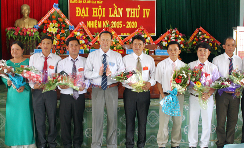 Đồng chí Lê Quang Oanh tặng hoa chúc mừng các đồng chí được bầu vào Ban Chấp hành Đảng bộ xã Bù Gia Mập, nhiệm kỳ 2015-2020