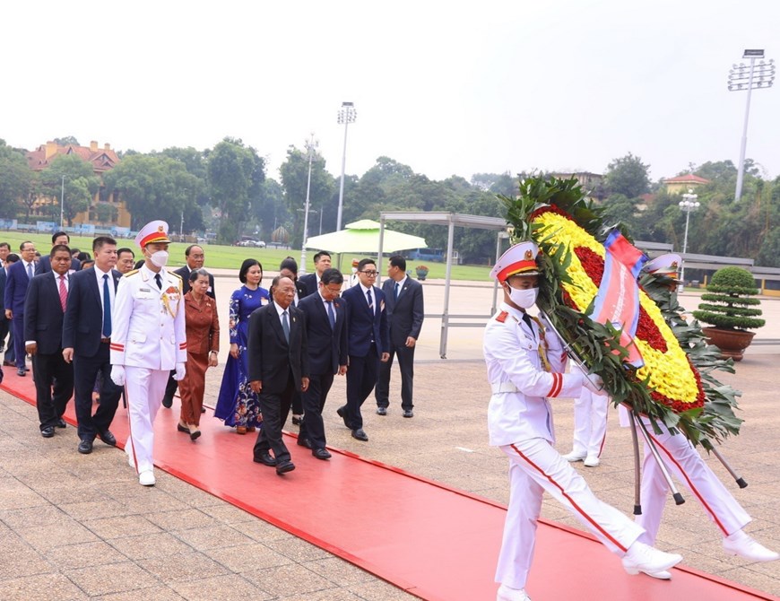 Chủ tịch Quốc hội Vương quốc Campuchia Samdech Heng Samrin cùng Đoàn đại biểu cấp cao Quốc hội Vương quốc Campuchia đến đặt vòng hoa và vào Lăng viếng Chủ tịch Hồ Chí Minh. (Ảnh: Văn Điệp/TTXVN)