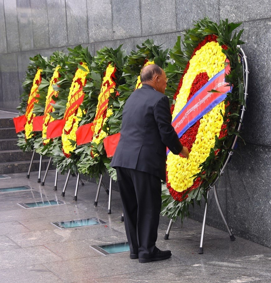 Chủ tịch Quốc hội Vương quốc Campuchia Samdech Heng Samrin chỉnh sửa vòng hoa tại Lăng viếng Chủ tịch Hồ Chí Minh. (Ảnh: Văn Điệp/TTXVN)