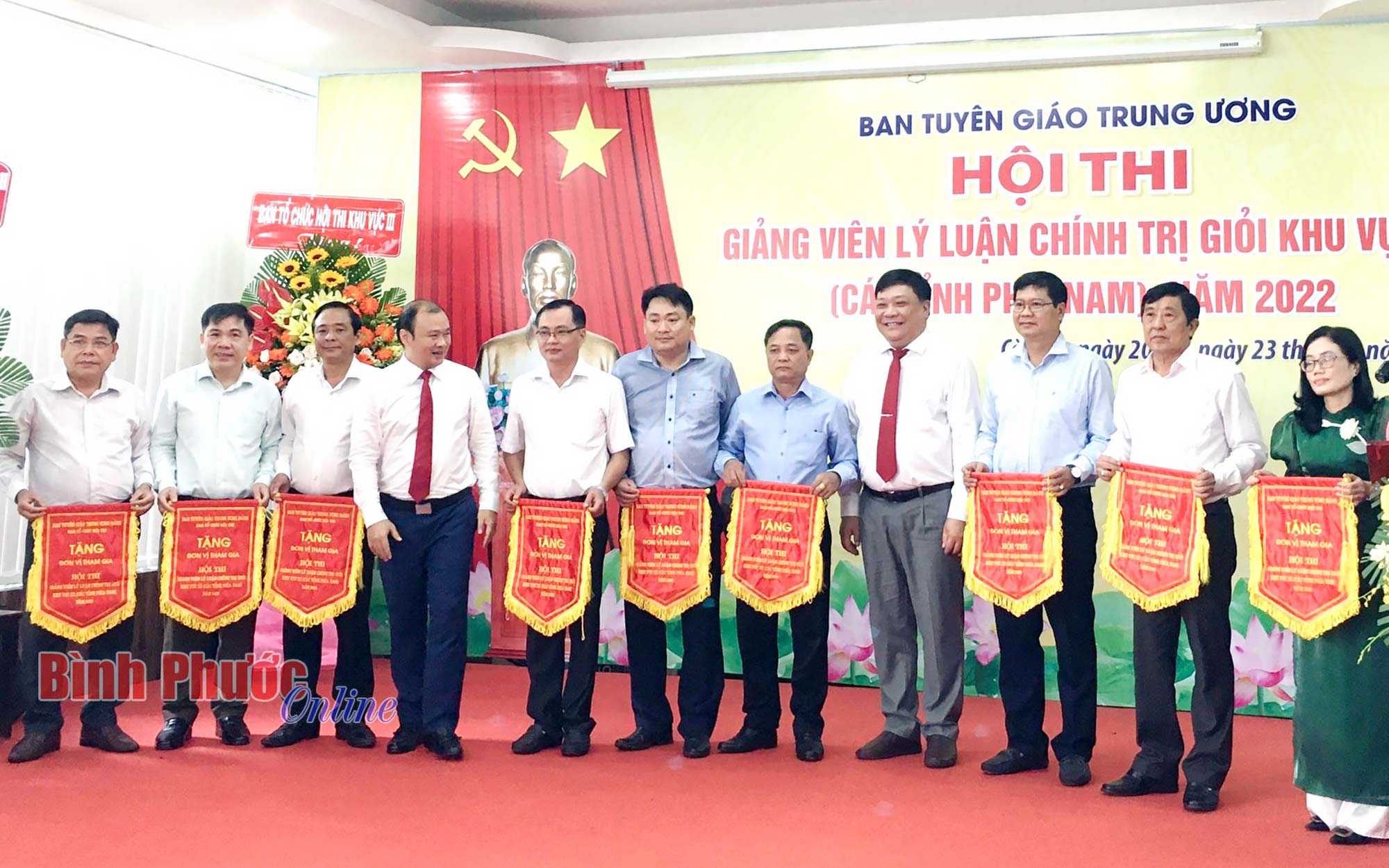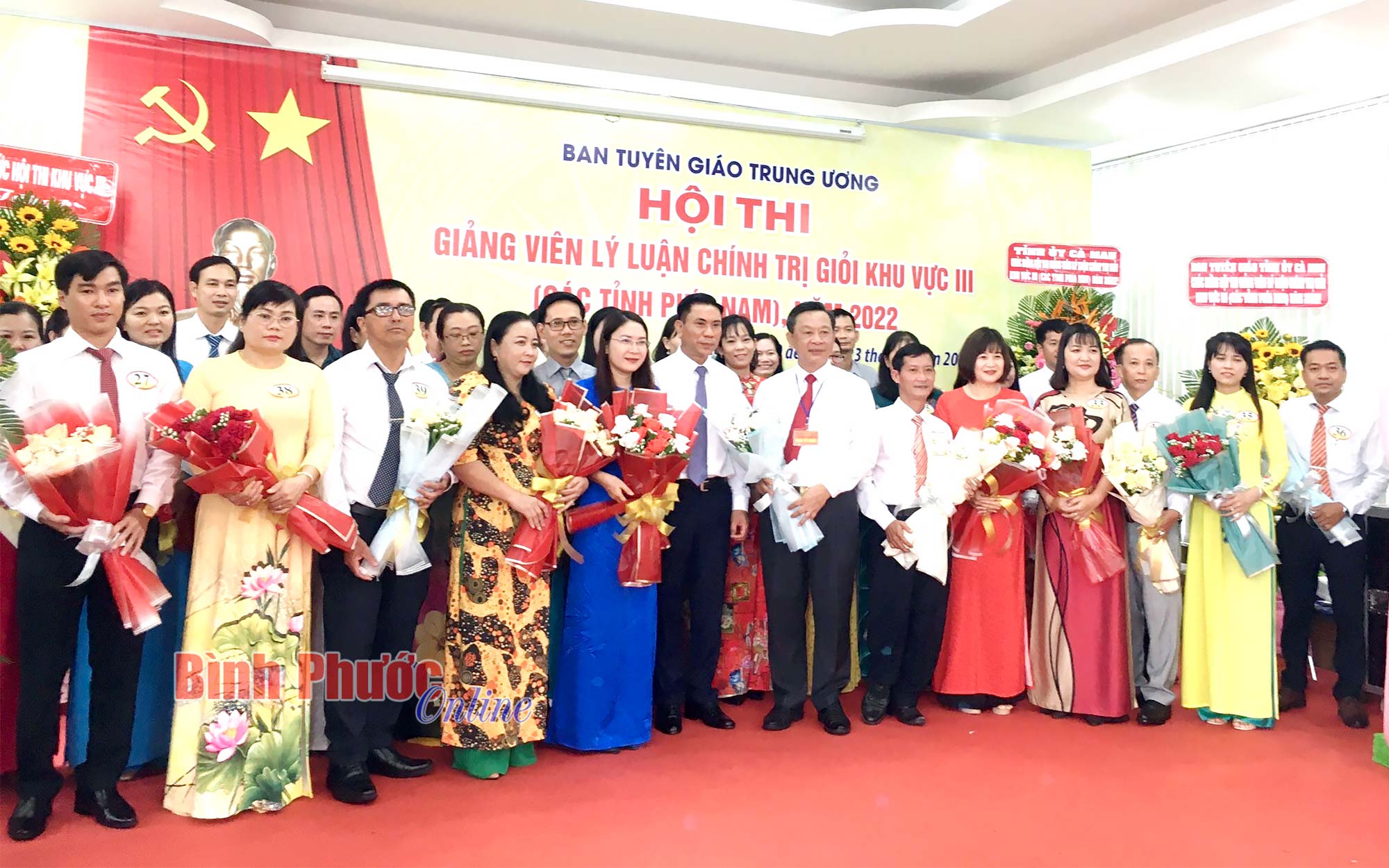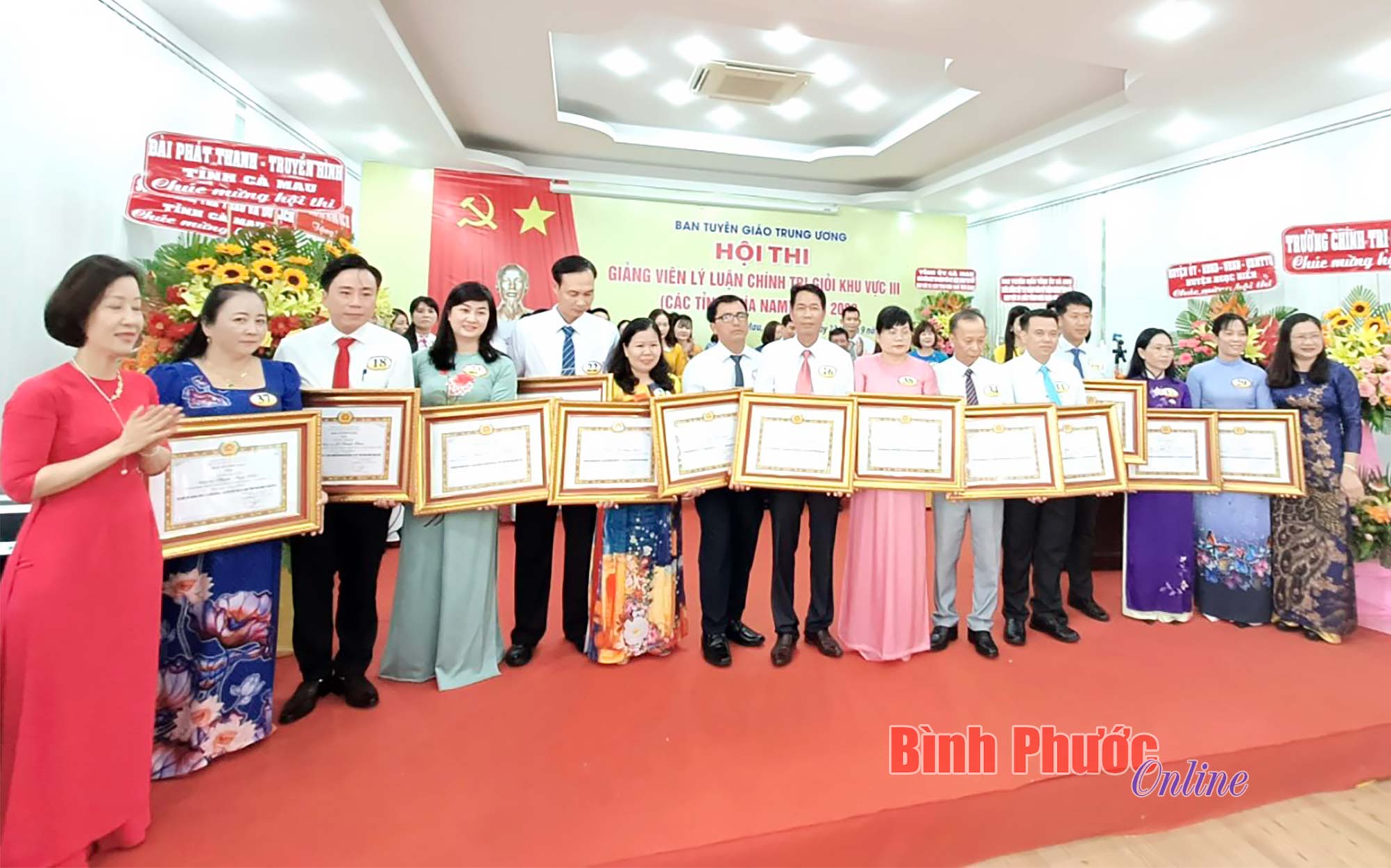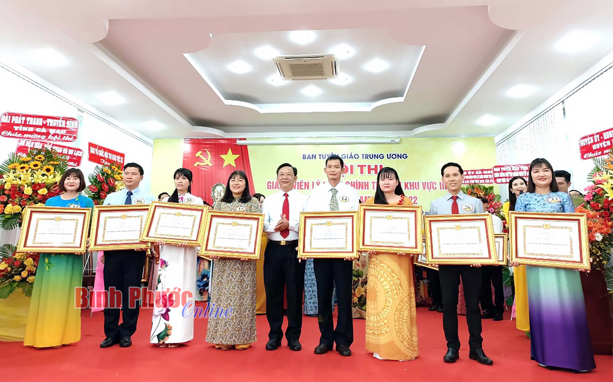 Phó Vụ trưởng Vụ Lý luận chính trị Ban Tuyên giáo Trung ương Đào Thị Mai Phương và Phó chánh Văn phòng Ban Tuyên giáo Trung ương Chu Thị Bích Loan trao giải khuyến khích cho các thí sinh. Thí sinh tỉnh Bình Phước Lưu Tiến Dũng (thứ 5 từ phải sang) đoạt giải khuyến khích tại hội thi