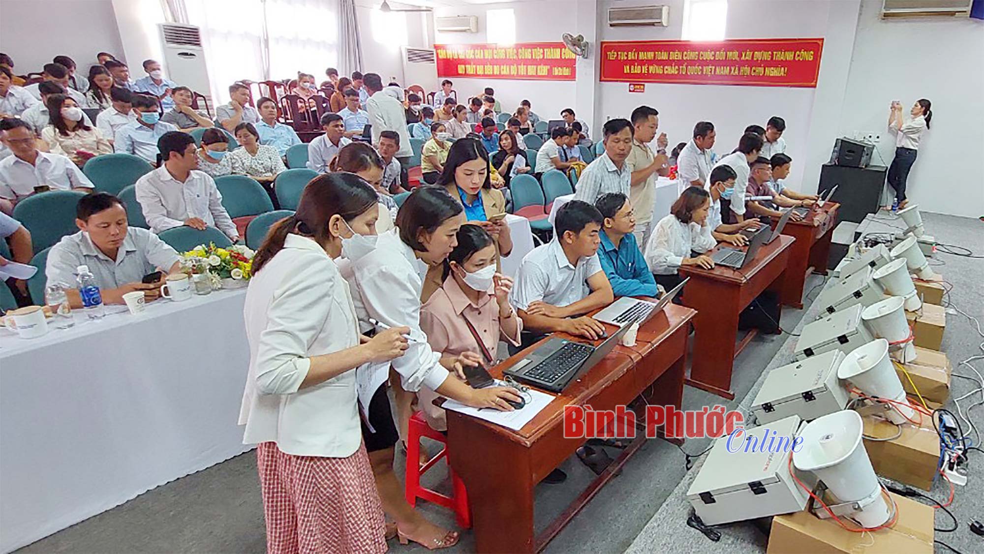Thực hành vận hành hệ thống truyền thanh ứng dụng công nghệ thông tin tại hội nghị tập huấn
