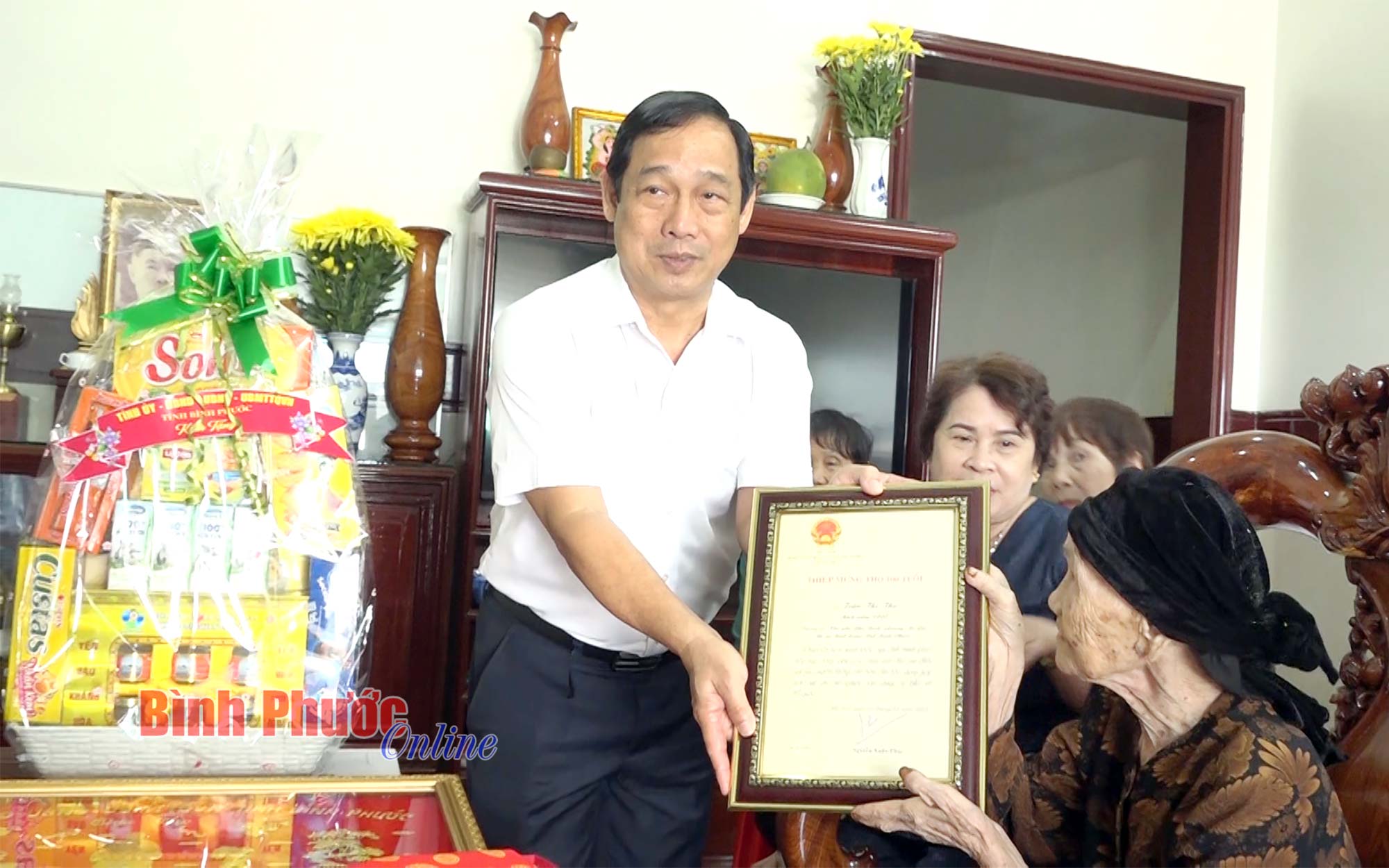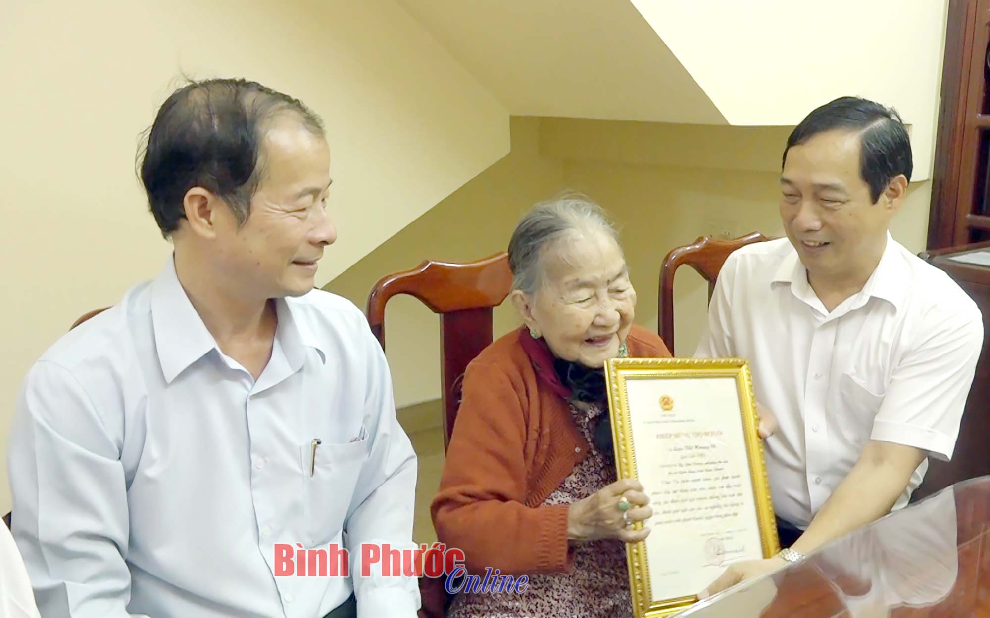 Ủy viên Ban Thường vụ Tỉnh ủy, Phó chủ tịch Thường trực HĐND tỉnh Lê Hoàng Lâm trao thiệp chúc mừng của Chủ tịch nước và khánh vàng của Tỉnh ủy, HĐND, UBND, UBMTTQVN tỉnh Bình Phước tặng cụ Trần Thị Tho tròn 100 tuổi