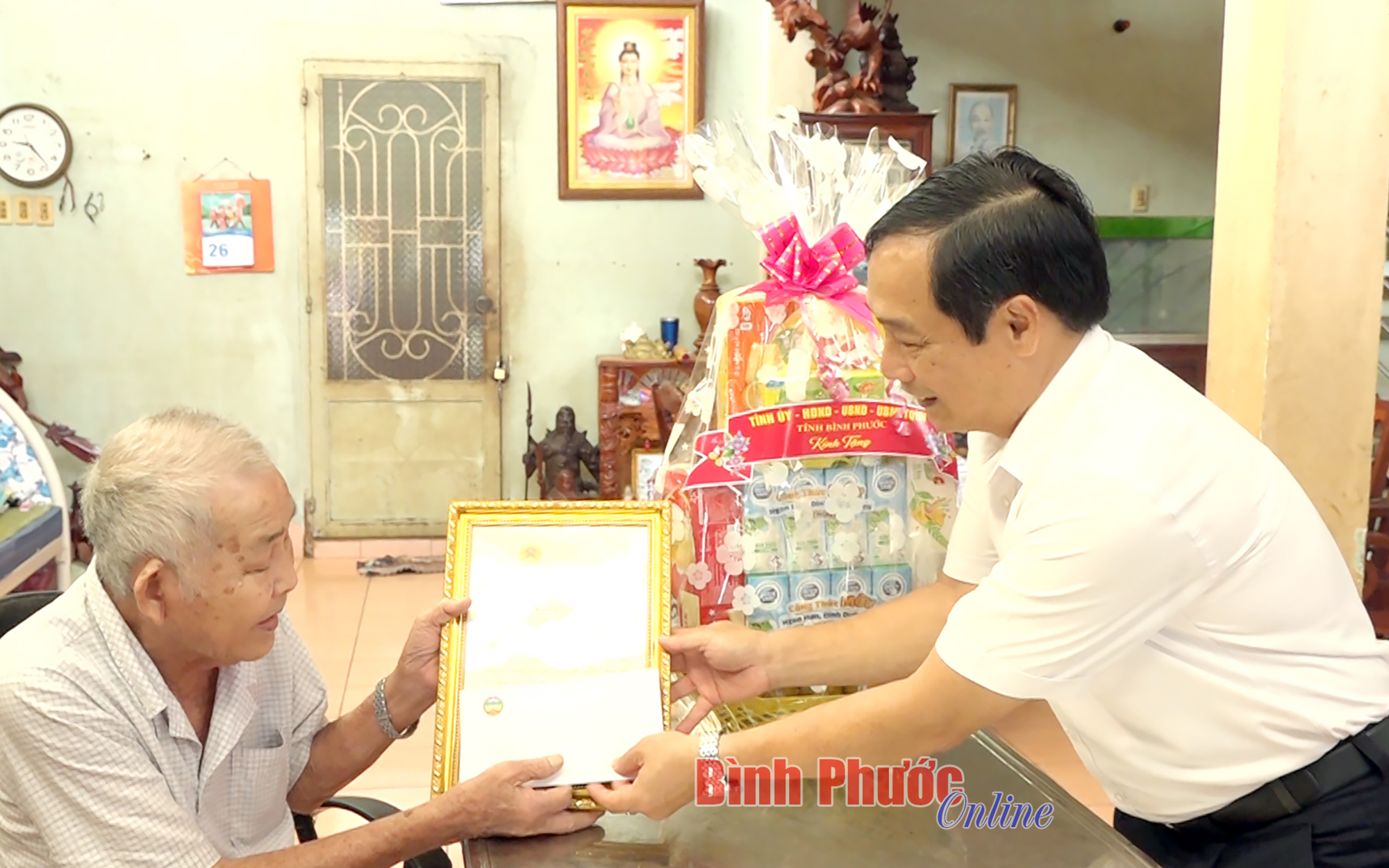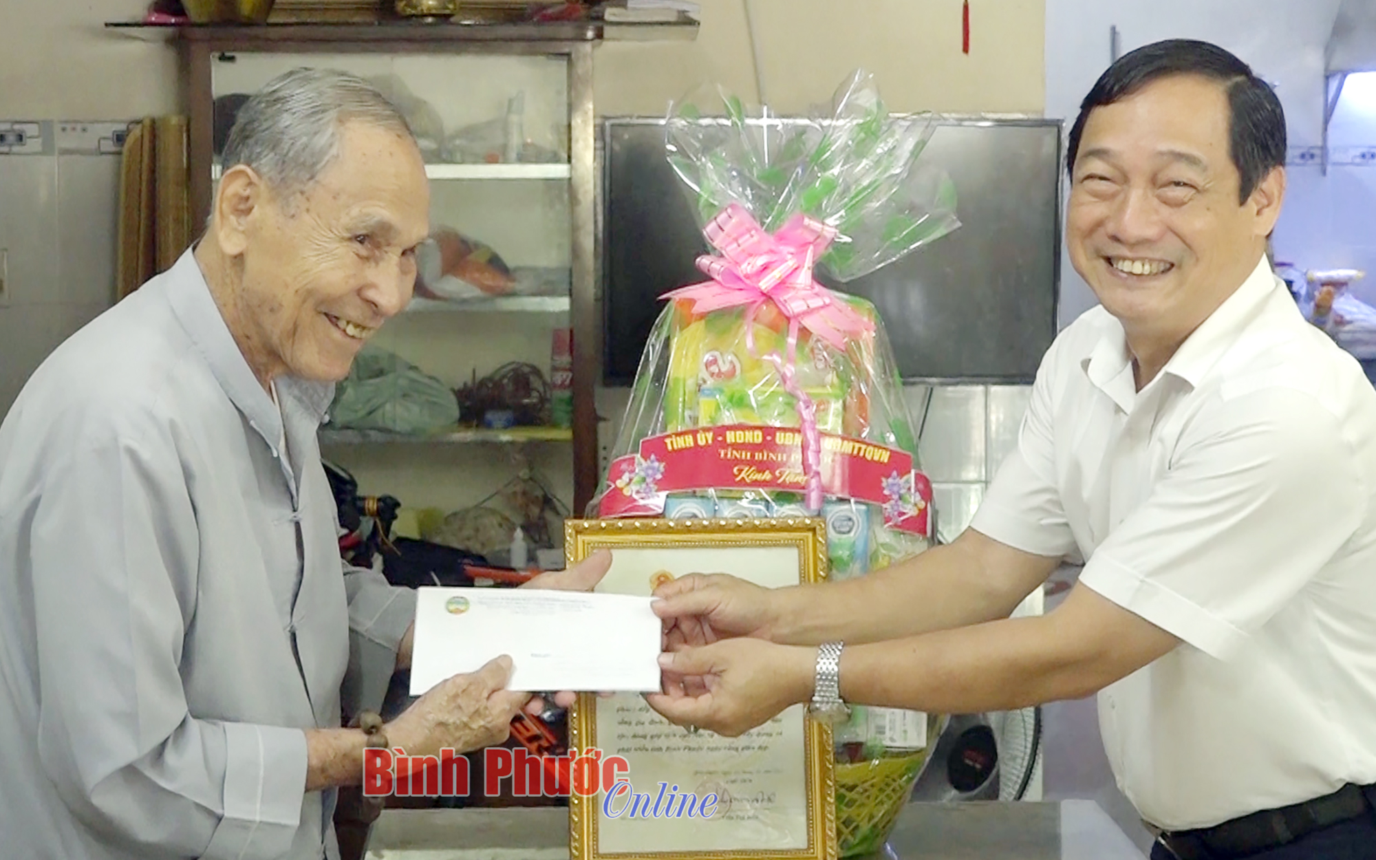 Ủy viên Ban Thường vụ Tỉnh ủy, Phó chủ tịch Thường trực HĐND tỉnh Lê Hoàng Lâm cùng đoàn đến thăm và chúc thọ cụ Trần Văn Giống, 90 tuổi, khu phố Phú Bình, phường An Lộc