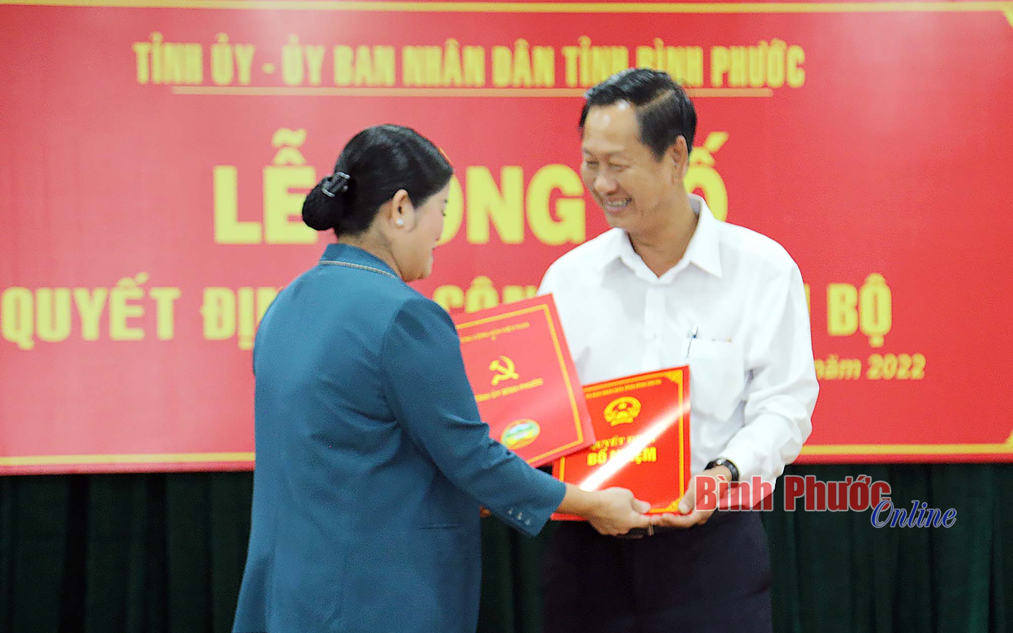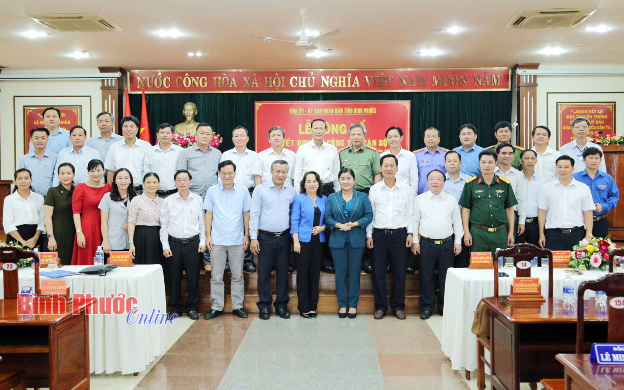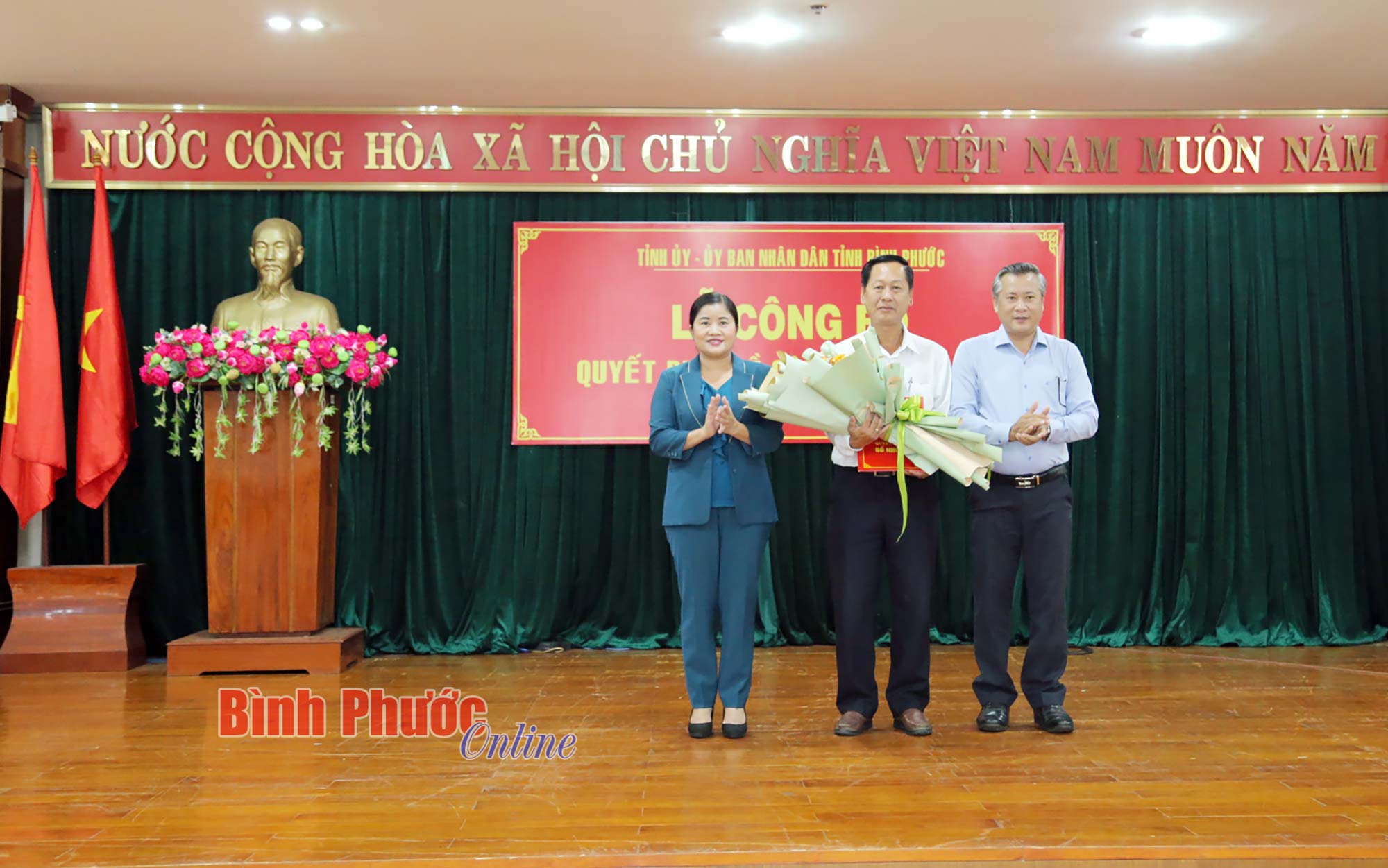 Phó bí thư Tỉnh ủy, Chủ tịch UBND tỉnh Trần Tuệ Hiền và Tỉnh ủy viên, Bí thư Huyện ủy Bù Gia Mập Phùng Hiệp Quốc trao quyết định, tặng hoa chúc mừng ông Đoàn Văn Thảo