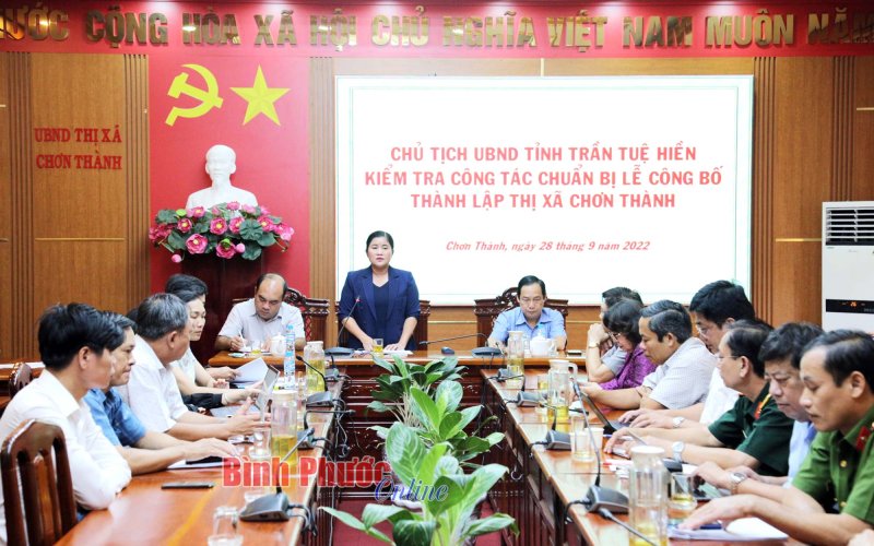 Đảm bảo lễ công bố thành lập thị xã Chơn Thành diễn ra an toàn, thành côngBPO - Chiều nay 28-9, Phó bí thư Tỉnh ủy, Chủ tịch UBND tỉnh Bình Phước Trần Tuệ Hiền, Trưởng ban tổ chức lễ công bố; Ủy viên Ban Thường vụ Tỉnh ủy, Phó chủ tịch Thường trực HĐND tỉnh Lê Hoàng Lâm; Ủy viên Ban Thường vụ Tỉnh ủy, Bí thư Huyện ủy Chơn Thành Nguyễn Tấn Hải cùng lãnh đạo các ban, sở, ngành đã có buổi kiểm tra công tác chuẩn bị lễ công bố Nghị quyết số 570/NQ-UBTVQH15 ngày 11-8-2022 của Ủy ban Thường vụ Quốc hội về thành lập thị xã Chơn Thành và các phường thuộc thị xã Chơn Thành.