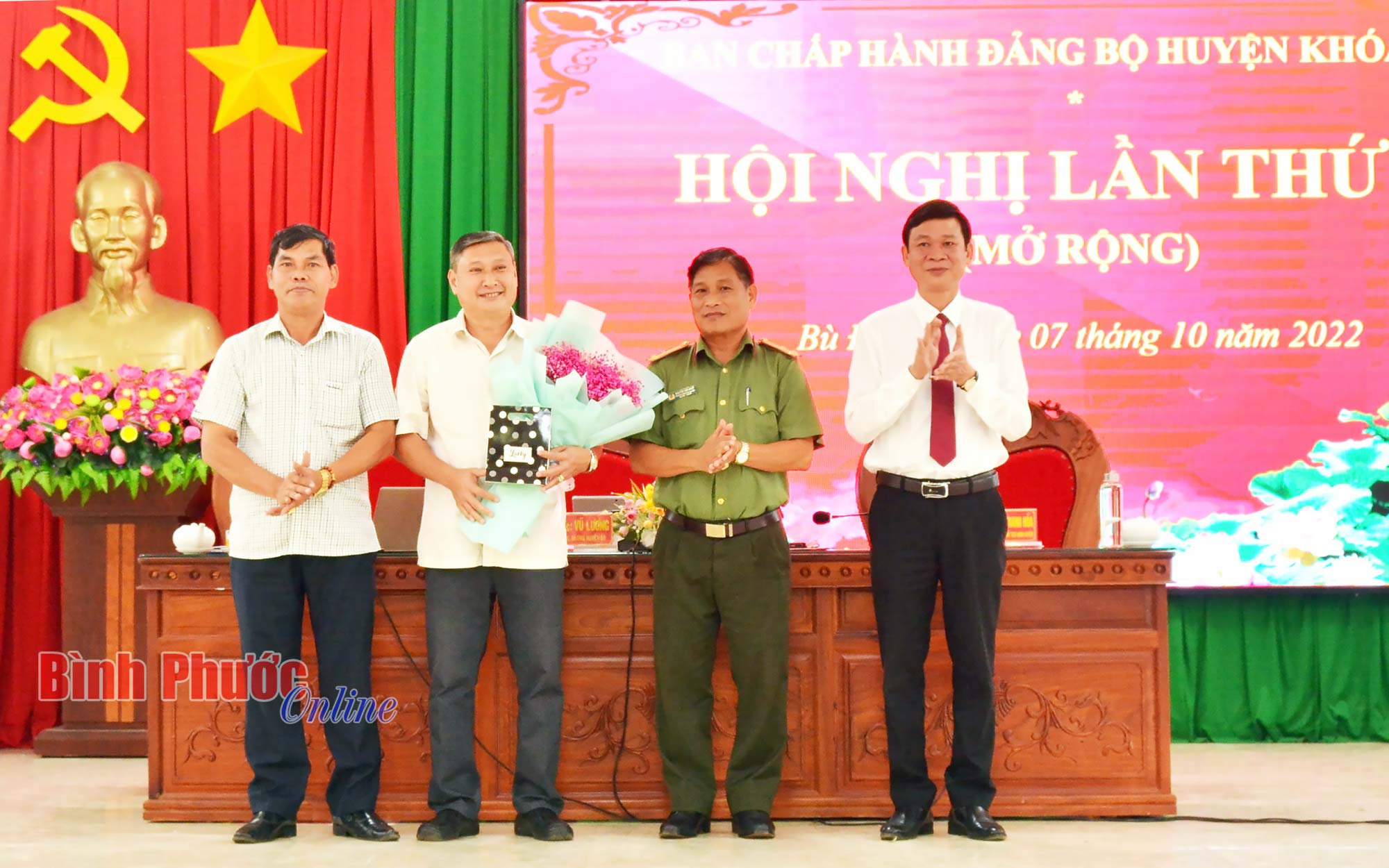 Lãnh đạo huyện tặng hoa tri ân nguyên Ủy viên Ban Chấp hành Đảng bộ huyện chuyển công tác