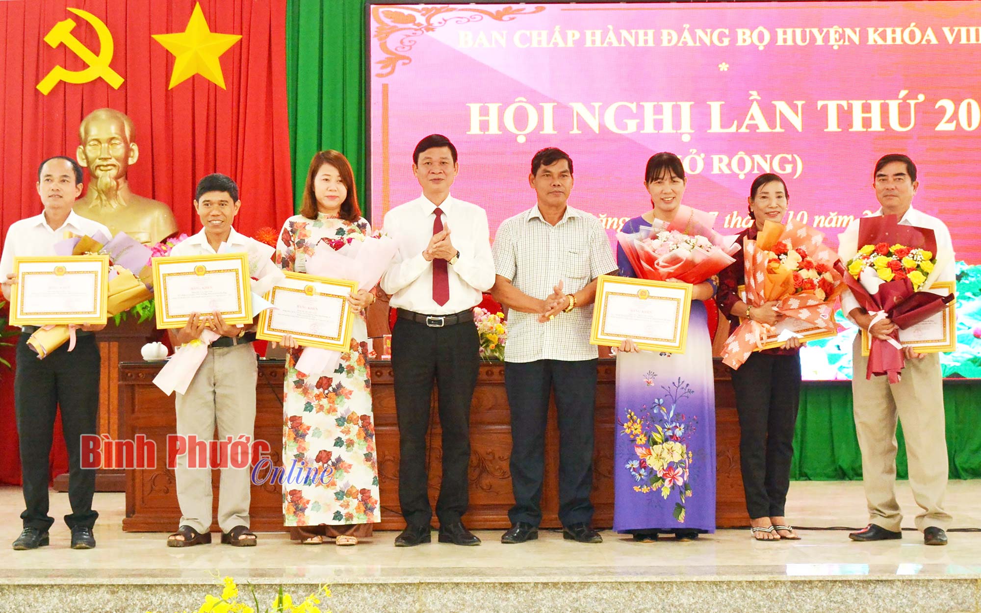 Dịp này, Ban Thường vụ Huyện ủy đã trao khen thưởng của Tỉnh ủy cho 7 đảng viên hoàn thành xuất sắc nhiệm vụ 5 năm liền và tặng hoa cho các nguyên Ủy viên Ban Chấp hành Đảng bộ huyện chuyển công tác.