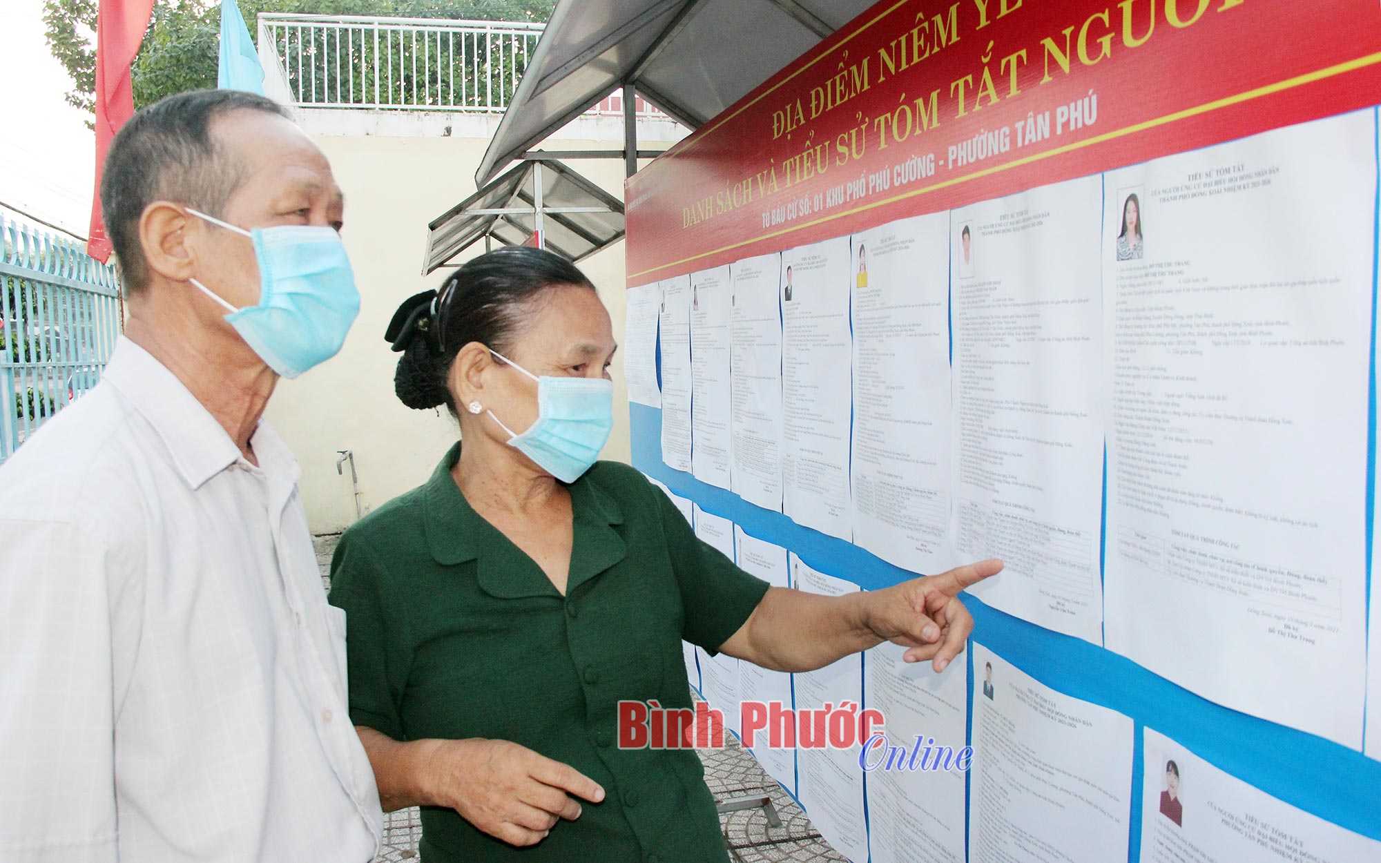 Cán bộ và nhân dân khu phố Phú Cường, phường Tân Phú, thành phố Đồng Xoài tham gia giám sát, theo dõi tiểu sử các ứng cử viên đại biểu Quốc hội khóa XV và HĐND các cấp nhiệm kỳ 2021-2026